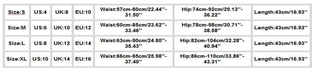 | Размеры: XL | Свяжитесь с нами: 10 | UK: 14 | ЕС: 16 | Талия: 66 см-95 см/25,98 ''-37,40'' | Бедра: 86 см-110 см/33,86 ''-43,31'' | Длина: 43 см/16,93'' |
