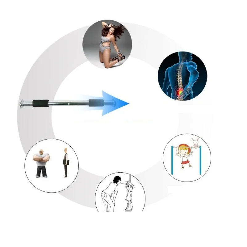Product parameters Material: steel Suitable for door width: 62 * 100cm Product Name: door on the horizontal bar / pull up Assembly instructions: Step 1: Secure the rubber stopper on the door frame with screws. Step 2: Turn the bar clockwise until the end of the rod is tightly pressed against the door frame. WARNING: Before proceeding, please check and make sure the bar is secure. Door horizontal bar * 1