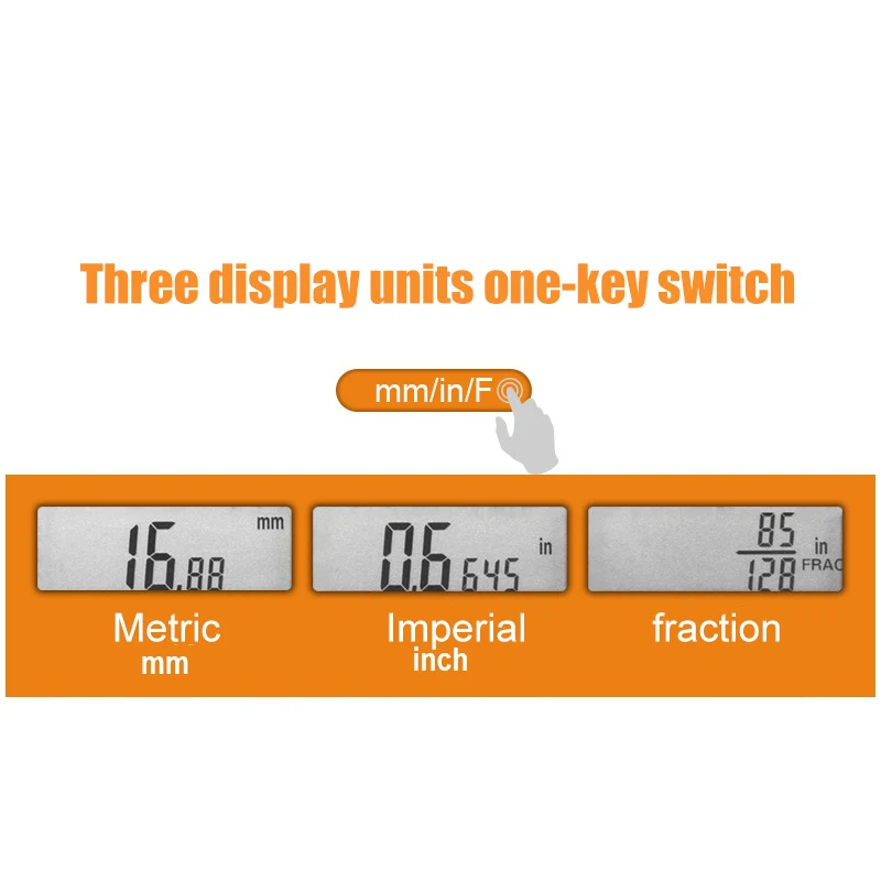 1. Мм/in/конверсионный переключатель с дисплеем фракций, переключатель Калибровки нуля для удобной работы.