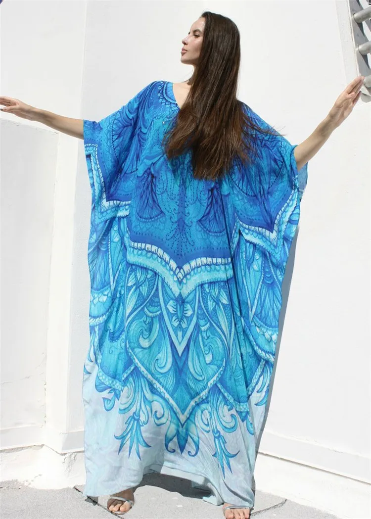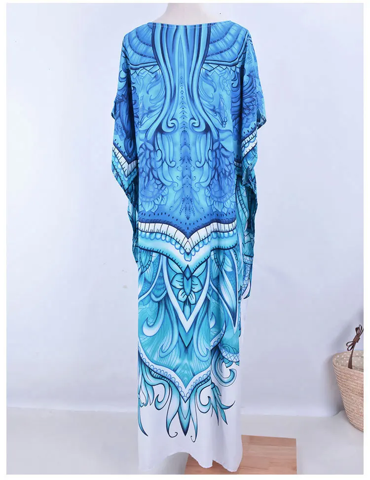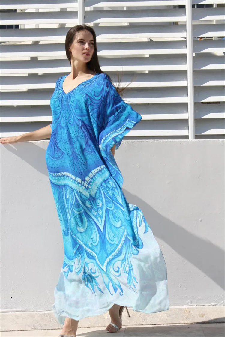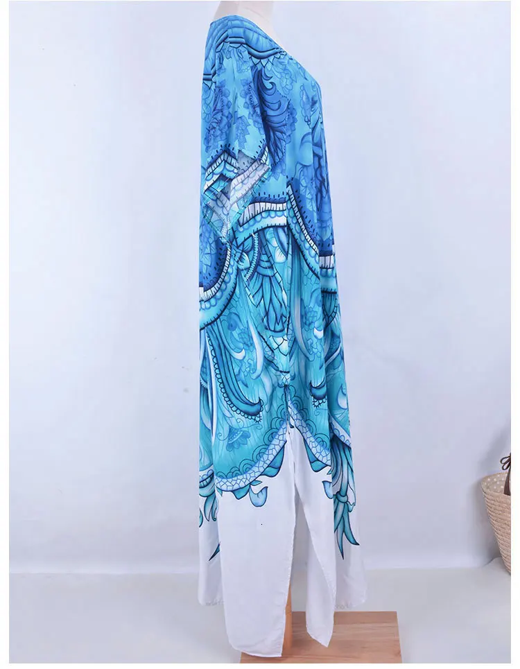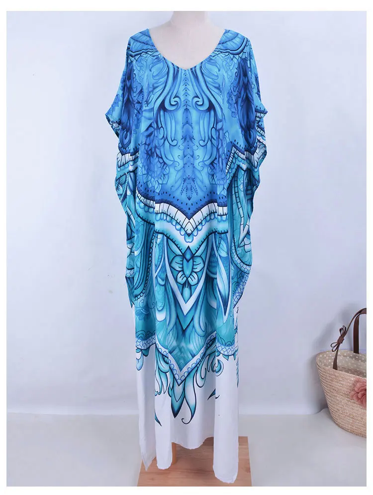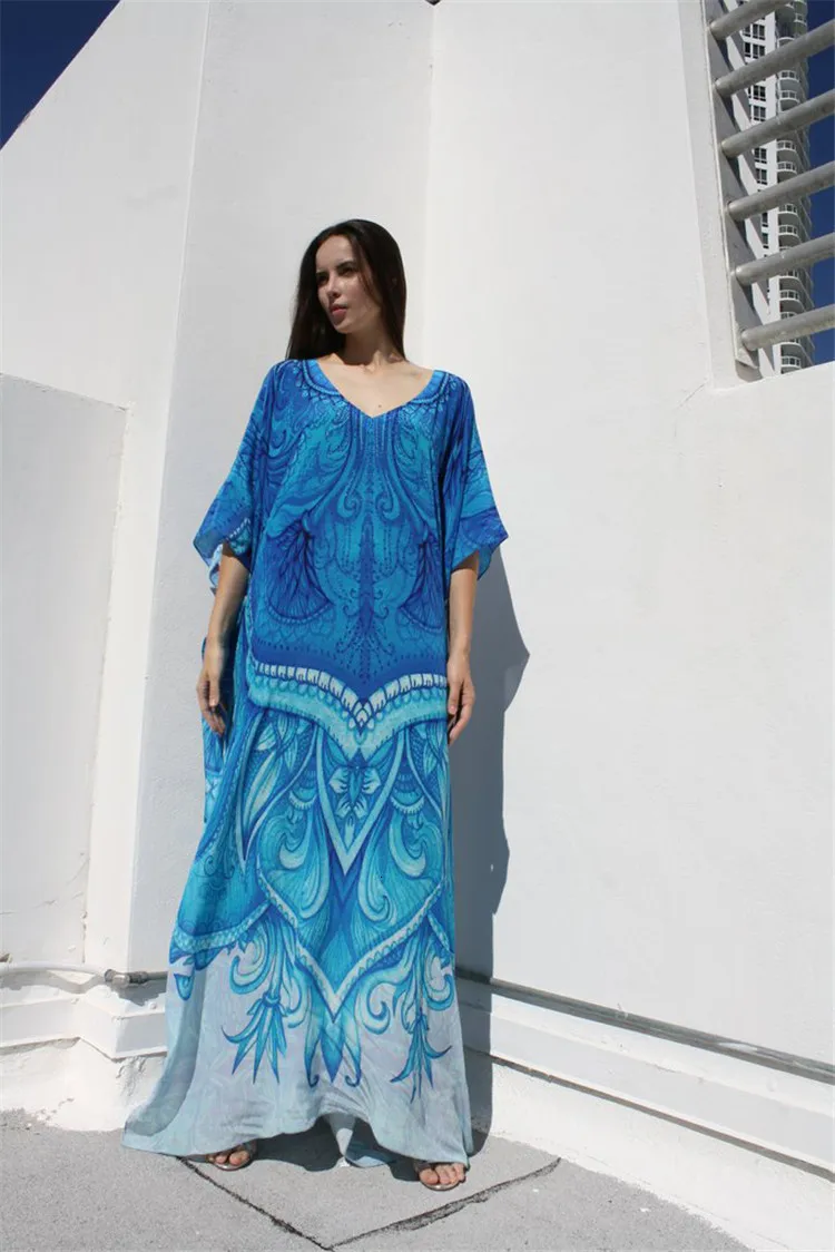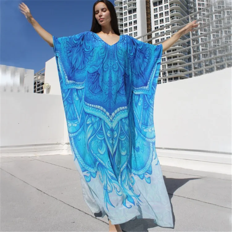Пляжное платье-Кафтан с принтом морского синего цвета, женское пляжное платье макси большого размера, купальный костюм, накидка с рукавом «летучая мышь» 2019, летнее праздничное платье в стиле бохо