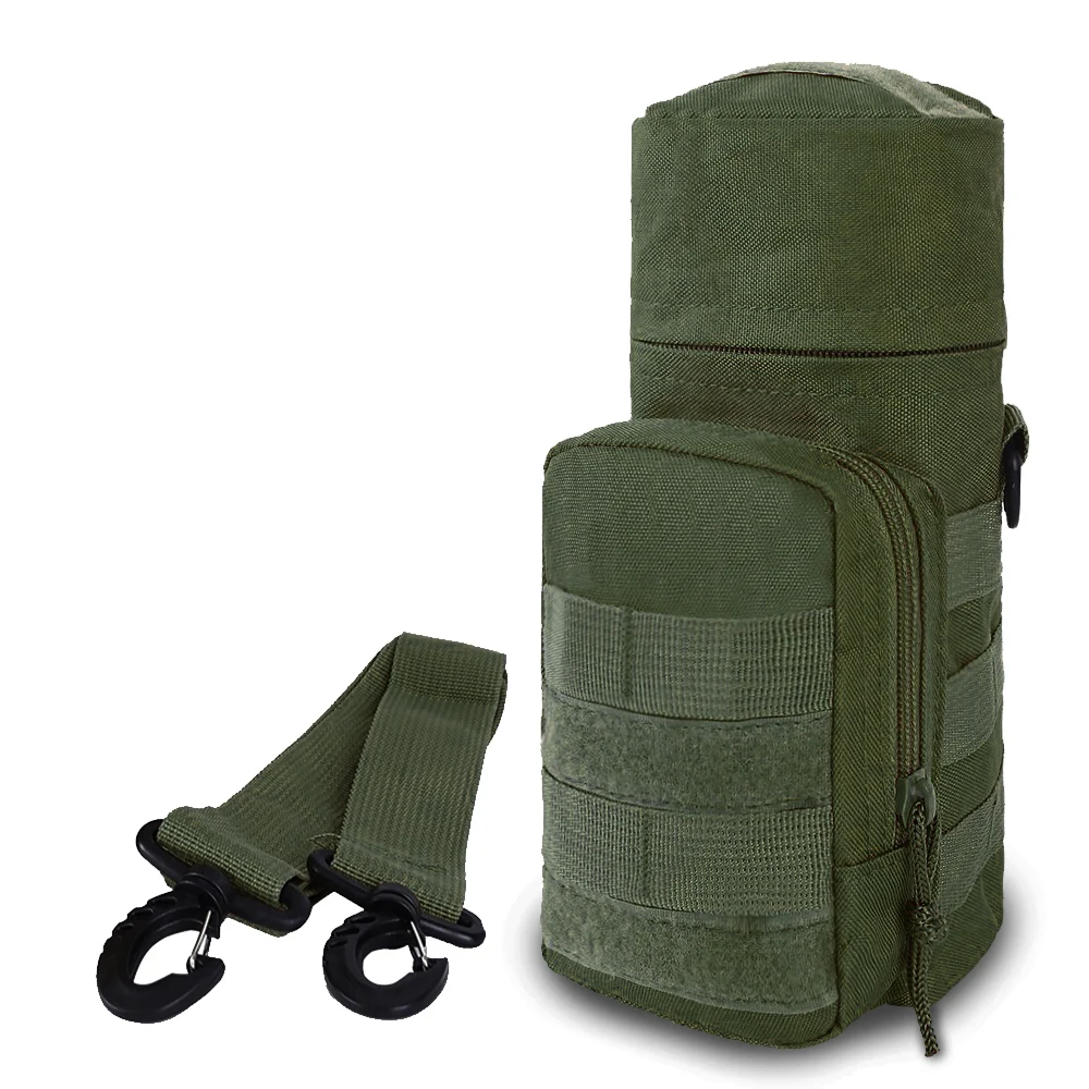 -Изготовлен из нейлона высокой плотности-можно прикрепить к любой жилетке, сумке, рюкзаку или поясу. -Застежка-молния для основного мешка, возможность хранения больших спортивных бутылок для воды. -Боковой карман на молнии для небольших зубчатых колес и аксессуаров. -Может использоваться в качестве утилиты/журнала/мешка для сброса. -D-образных уплотнительных кольца на 2 кристалла по бокам для другой способ. -Металлический зажим на спине. -Подходит для 0,5 -- 1L бутылка для воды