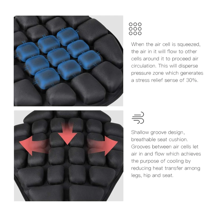 Сброс давления: Наша эргономичная подушка сиденья мотоцикла использует мозаику небольших подушек, которые могут быть заполнены воздухом или водой. Технология конвекции воздуха производит и антигравитационный эффект, который обеспечивает поддержку вашего позвоночника, бедра и бедер. Для достижения эффекта амортизации и снятия стресса.