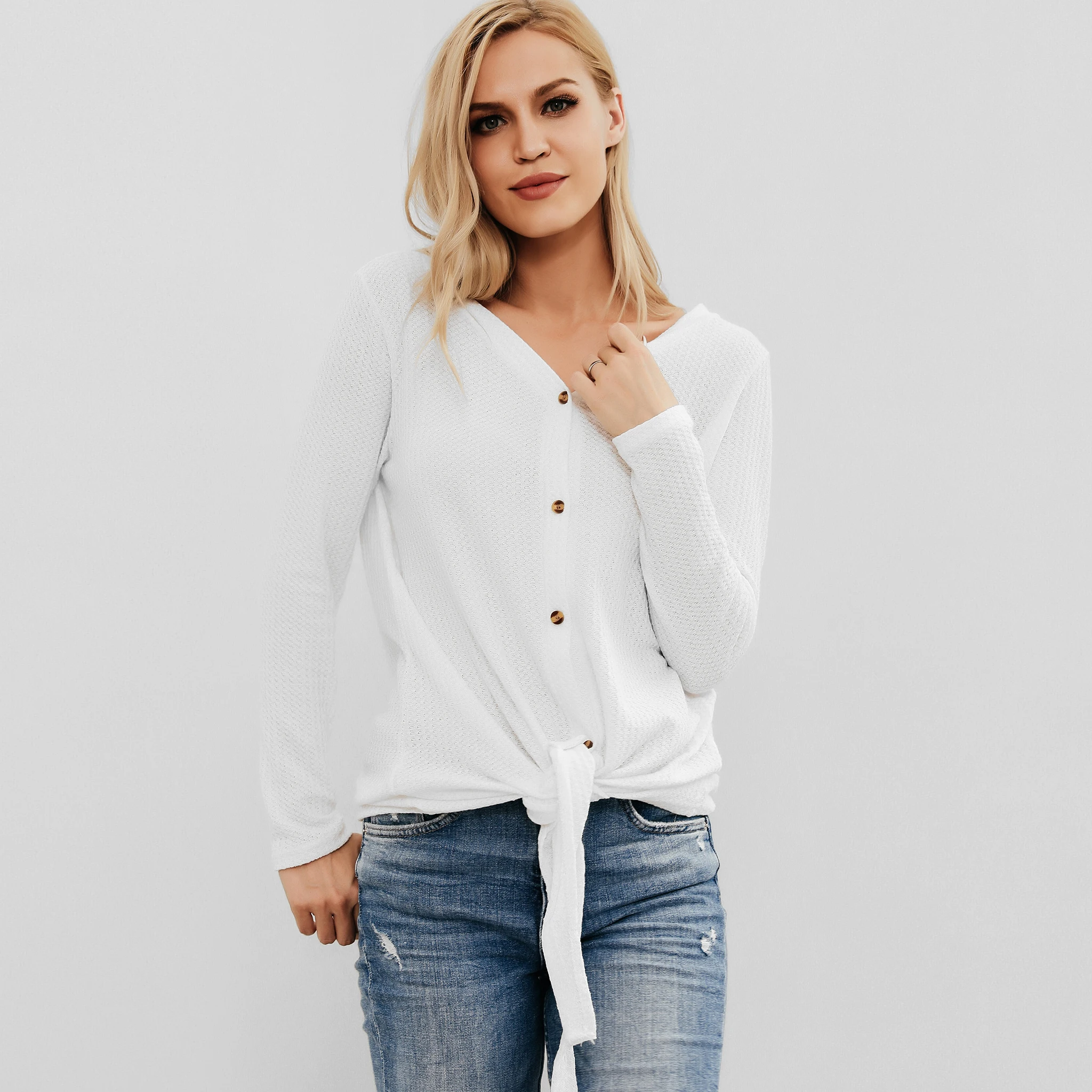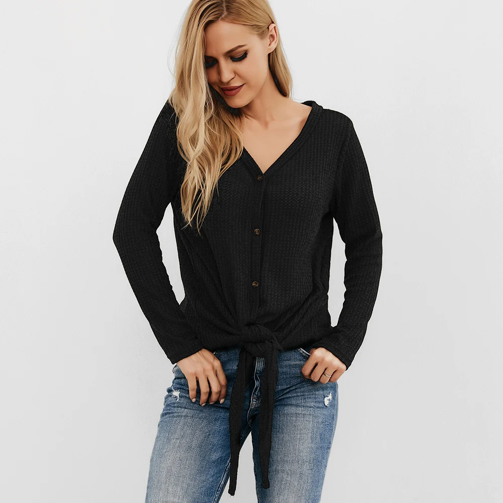 Sassy Long-sleeve V-neck Thin Solid T-shirt Top with Tie For women