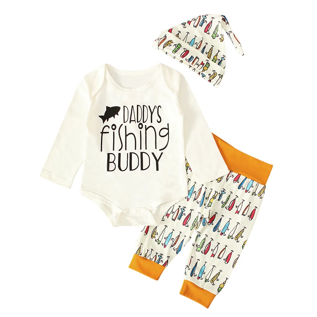 Newborn Baby Boy Fishing Hunting Tops Romper Pants Hat Outfits Fisherman Set