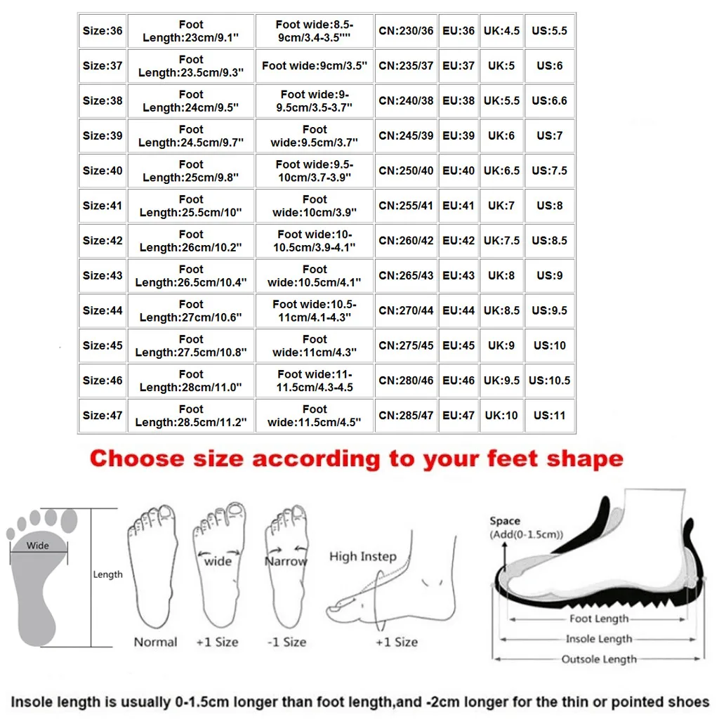 Size Foot Length Foot wide CN EU UK US 36 23cm/9.1" 8.5-9cm/3.4-3.5"" 230/36 36 4.5 5.5 37 23.5cm/9.3" 9cm/3.5" 235/37 37 5 6 38 24cm/9.5" 9-9.5cm/3.5-3.7" 240/38 38 5.5 6.6 39 24.5cm/9.7" 9.5cm/3.7" 245/39 39 6 7 40 25cm/9.8" 9.5-10cm/3.7-3.9" 250/40 40 6.5 7.5 41 25.5cm/10" 10cm/3.9" 255/41 41 7 8 42 26cm/10.2" 10-10.5cm/3.9-4.1" 260/42 42 7.5 8.5 43 26.5cm/10.4" 10.5cm/4.1" 265/43 43 8 9 44 27cm/10.6" 10.5-11cm/4.1-4.3" 270/44 44 8.5 9.5 45 27.5cm/10.8" 11cm/4.3" 275/45 45 9 10 46 28cm/11.0" 11-11.5cm/4.3-4.5 280/46 46 9.5 10.5 47 28.5cm/11.2" 11.5cm/4.5" 285/47 47 10 11