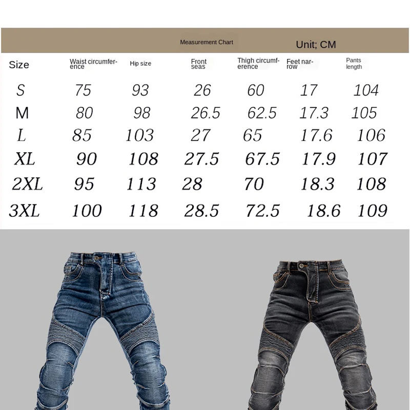 - - - Material:14oz Denim Cloth,97% Cotton + 3% Spandex - - - Jeans Style: Pencil Pants - - - Color: Blue,Black - - - Size: S,M,L,XL,XXL,XXXL - - - Fashion Trends and Riding Safety Design,4 Knee and Hip Protect Pads,Perfect for Motorcycle and Daily - - Knee and Back Waist Folding Design: Can give the Knight More Flexibility,Very Ergonomic High-tech Fabric of the Telescopic Function