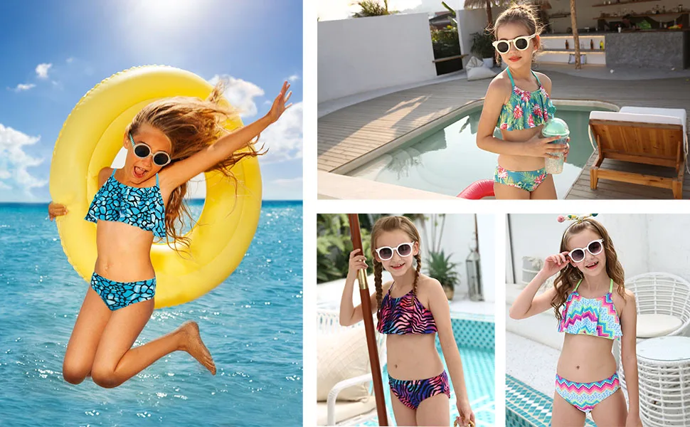 82% полиэстер, 18% эластан Импортированный Застежка на липучке Высококачественные материалы, приятные для кожи для детей, дышащие и быстросохнущие, полностью выровняны для скромности и комфорта Бикини с воланами, доступно в различных узоров, вашим маленьким девочкам понравится Нерегулируемые ремешки, вязанный крючком полый дизайн на спине 50 + защита от солнца UPF, защита детей от солнечных ожогов Доступно в размерах 4-16, идеальный купальник для пляжа, бассейна, серфинга, обучение плаванию или других водных видов деятельности, и в качестве отличного подарка
