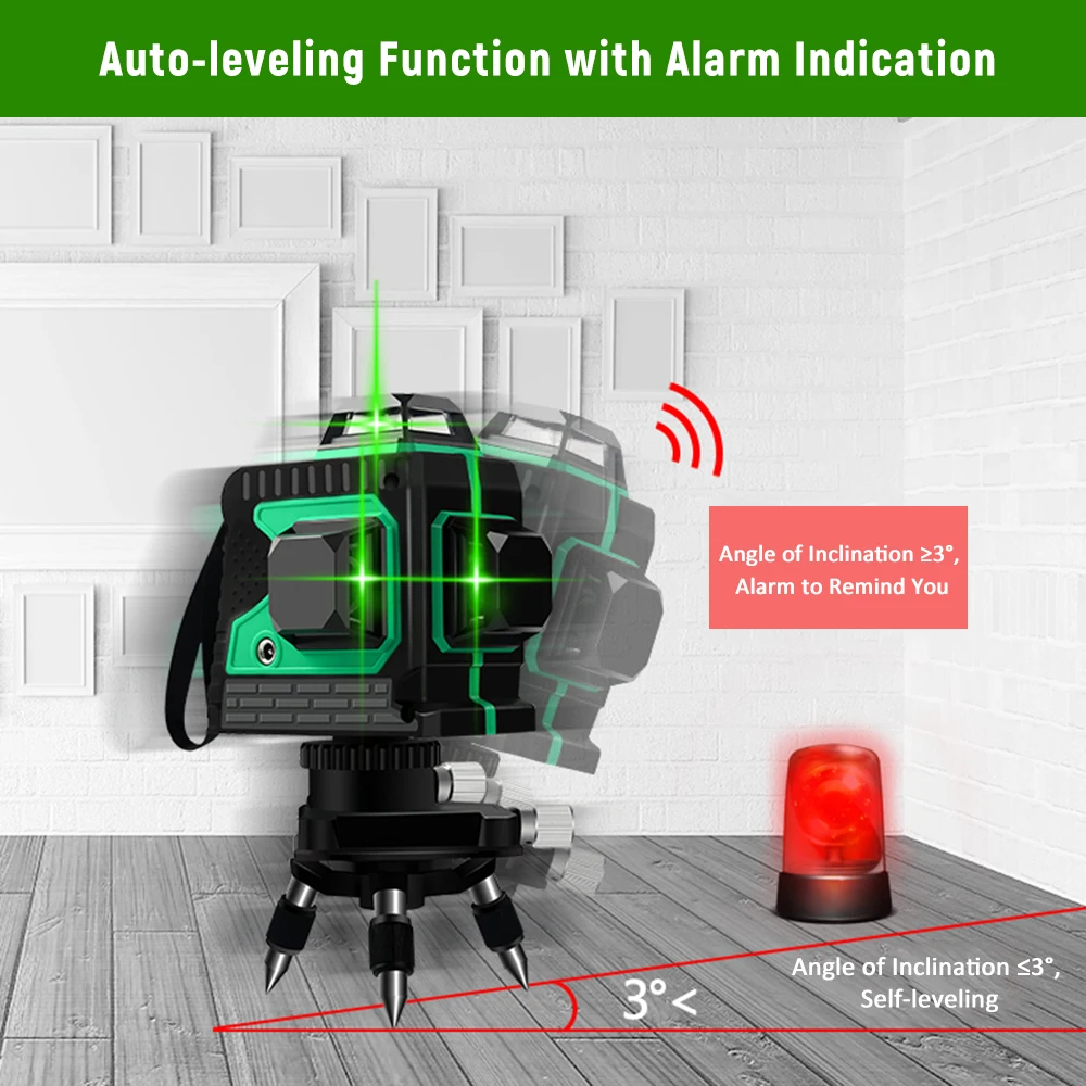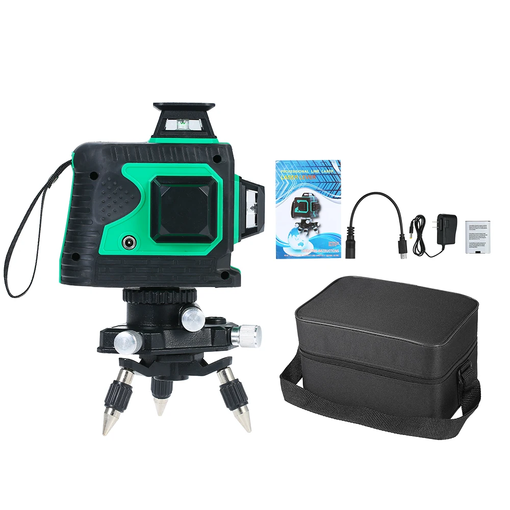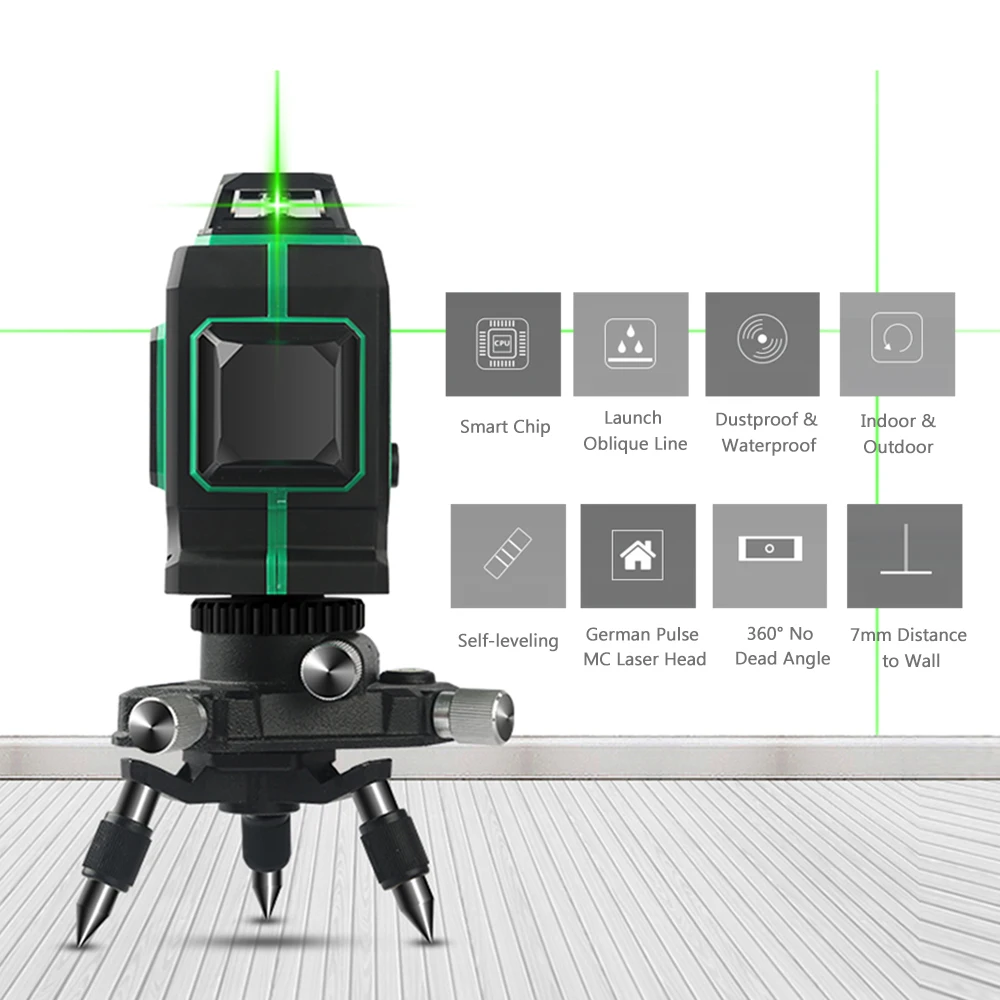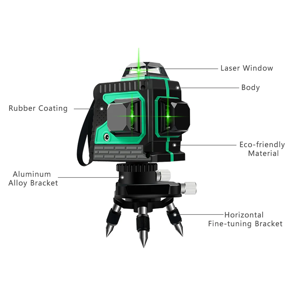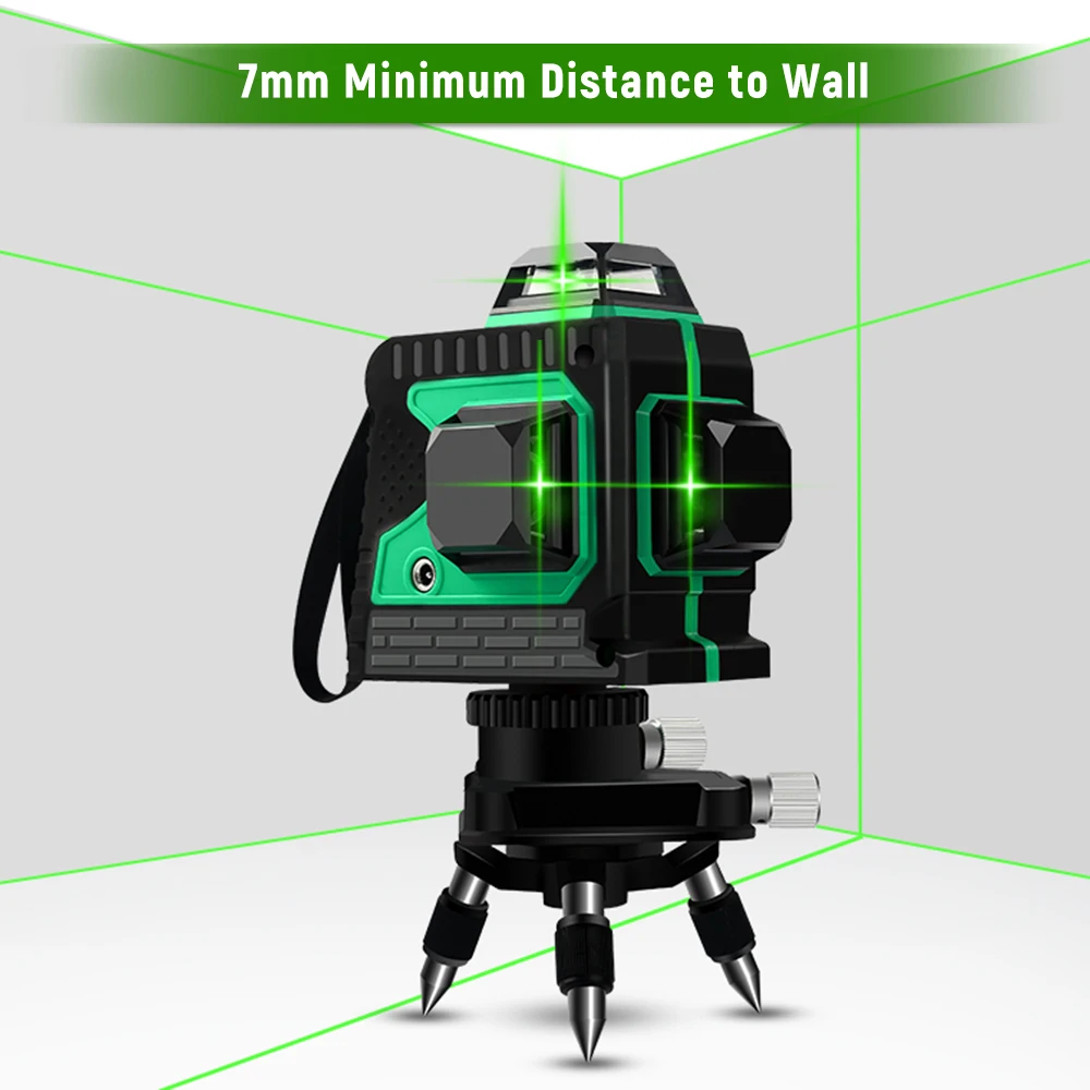 Лазерный уровень 3D 12 линий с лазером высокой яркости и дальним расстоянием проекции, может излучать 360 градусов видимые лазерные лучи как по горизонтали, так и по вертикали.