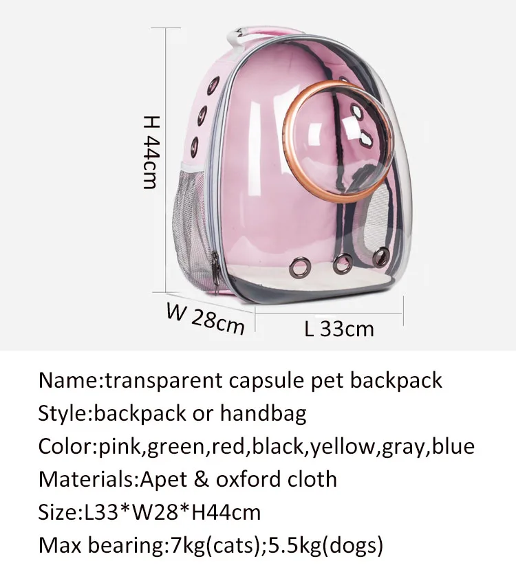 Размер: L29 * W27 * h42см Название: прозрачный рюкзак для домашних животных Уровень защиты: уровень Вес брутто: 1,16 кг Макс подшипника: 6,5 кг (коты);5 кг (собаки) Материал: APET и ткань Оксфорд