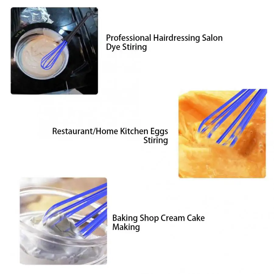 Этот товар состоит из 5 воздушных шаров, изготовленных из твердого и прочного пластика. Мягкая ручка не скользит и удобна в использовании. Этот венчик может быстро сделать пасту жидкостью, которая подходит для парикмахерской или кухни. Венчик мини-размера, легко брать и управлять. Конец ручки имеет крючок можно повесить и легко чистить. Это не только хорошие инструменты для взбивания краски для волос, но и идеально подходит для взбивания соусов, гравия и яиц.