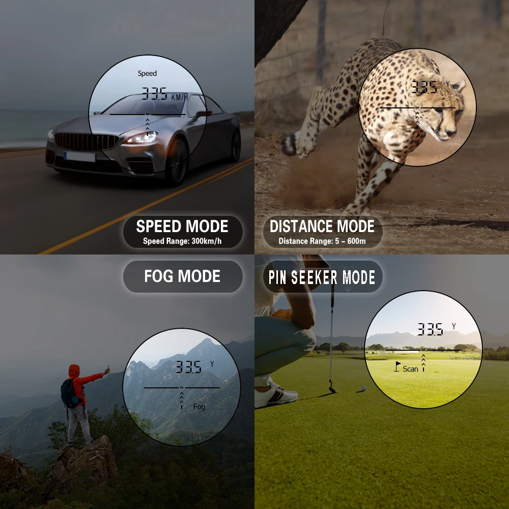 Высокая точность-дальномер Способен измерять Дальний диапазон от 5 до 600 метров с точностью +/- 1 м, И вы можете переключить измерения между метрами и ярдами, нажав кнопку «Mode». Измерение скорости движущегося объекта до 300 км/ч. Режим pin seeker позволяет гольфистам легко идентифицировать свои флаги.