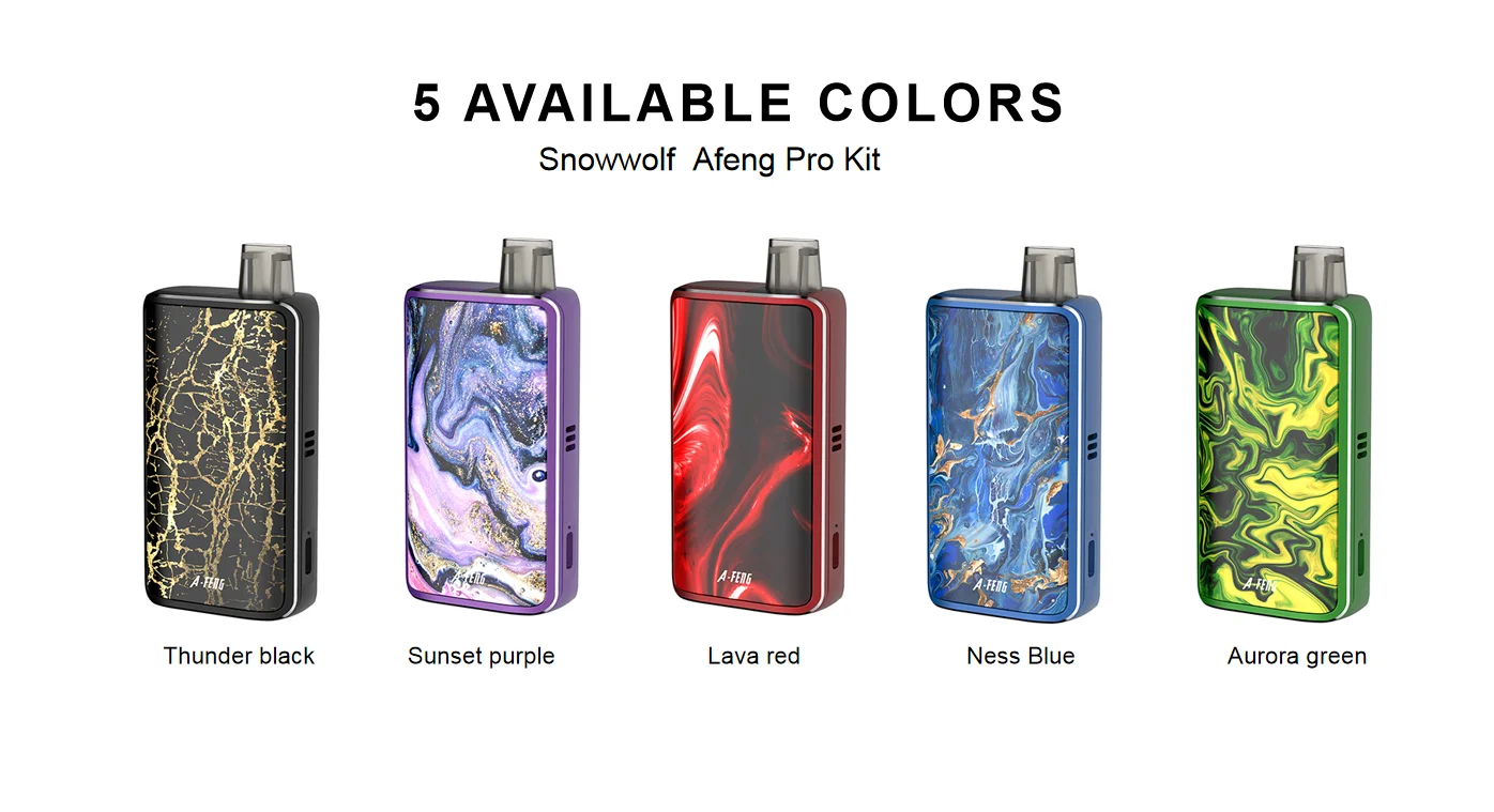 Afeng Pro, совершенно новый дизайн pod от Snowwolf, Это революционное изменение внешнего вида Дизайн. Эргономичный дизайн изогнутого корпуса И принимает обработку поверхности IML, Afeng Pro предоставляет вам обе Отличные ощущения от руки И модный вид. Что касается стручки, Можно выбрать емкость 2 мл и 3 мл. Это удовлетворит ваши ежедневные потребности. Afeng Pro также поддерживает быструю зарядку 2A, которая может ускорить время зарядки. Кроме того, Afeng Pro установлен умный чип внутри, который делает катушки, поток воздуха И e-juice имеют лучшую комбинацию для демонстрации Более плавный vaping опыт, который даст Идеальный вкус.