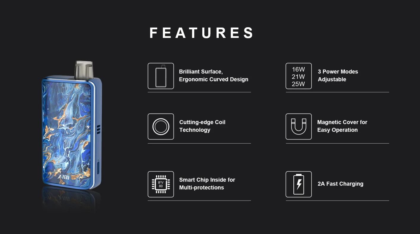 Благодаря уникальной технологии в катушке и регулируемой конструкции воздушного потока, Afeng позволяет вам наслаждаться большим опытом паров, а между тем, получить более богатый вкус, чтобы заменить курение.