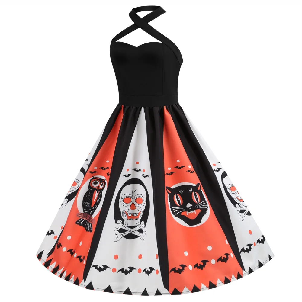 Wipalo Хэллоуин женское винтажное платье с принтом тыквы и черепа с открытыми плечами сексуальное платье на бретелях для вечеринки Хепберн в стиле пин-ап, рокабилли Vestidos