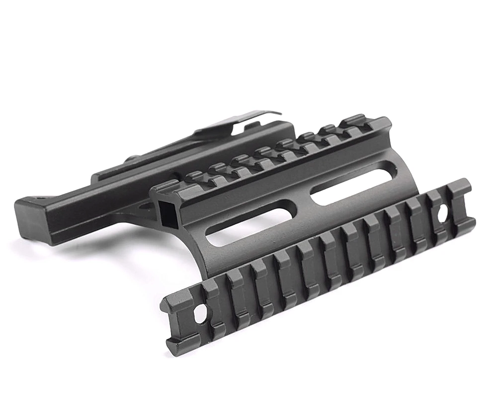 Информация об изделии: Цвет: черный Материал: авиационный алюминий для экстремальной прочности; Вес (нетто): около 258 г Размер: как на картинке Верхние рельсы: 12 отделений; Боковые направляющие: 8 слотов; Позволяет установить тактический светильник или лазер, прицел для вашей страйкбола; Устанавливается на стандартными боковыми разъемами кронштейн рельса с левой стороны приемника; Нового поколения. Двухстороннее крепление АК, оснащенное быстросъемным/блокировочным рычагом; Полностью регулируемый для большинства боковых рельсов АК.
