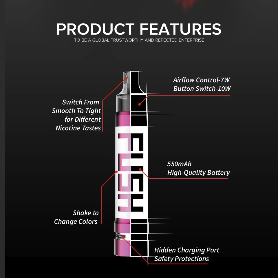 1. Визуальная революция, дышит новой жизнью 2. Пуленепробиваемые поликарбонатные (поликарбонатные) трубы, прочные и долговечные 3. Шесть вентиляционных отверстий для рассеивания тепла и декомпрессии 4. Красивый переключатель, простой и простой в использовании 5. Инновационная технология, почувствуйте вибрацию, чтобы изменить цвет 6. Питание от встроенной батареи 550 мАч