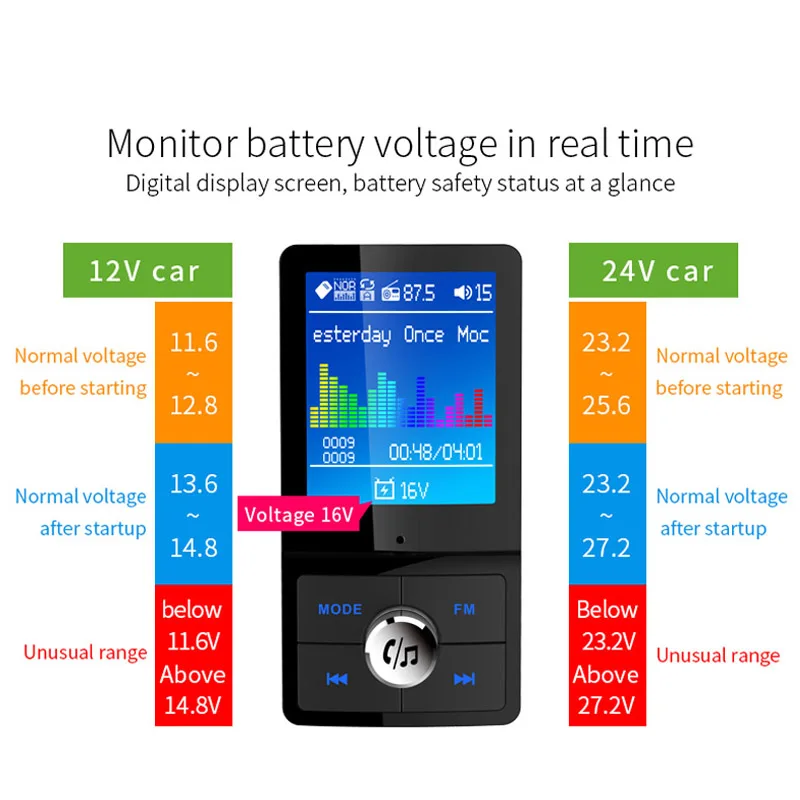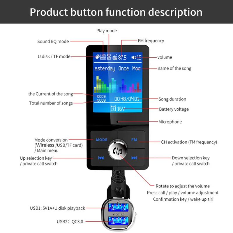 JaJaBor FM Transmitter Bluetooth Car kit Handsfree AUX-IN Car MP3 Player Support Folder Song Playback Large Color Screen Display