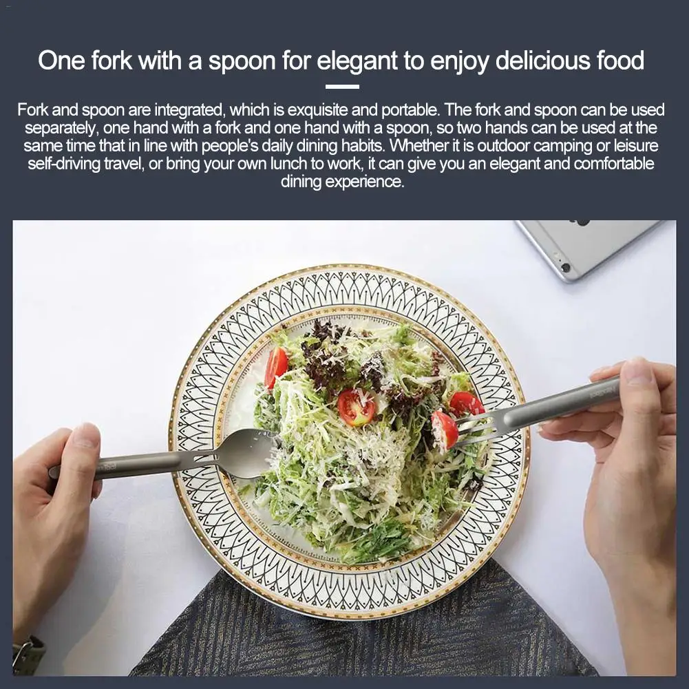 3. Удобный опыт работы: одна вилка с ложкой для элегантной еды. Вилка и ложка интегрированы, что является изысканным и портативным. Вилка и ложка можно использовать отдельно, одна рука с вилкой и одна рука с ложкой, так что две руки могут быть использованы одновременно, что в соответствии с повседневными привычками людей обедать. Вне зависимости от того, является ли это кемпинг на открытом воздухе или для отдыха самоуправляющимся путешествием, или для работы, он может дать вам элегантный и удобный обеденный опыт.