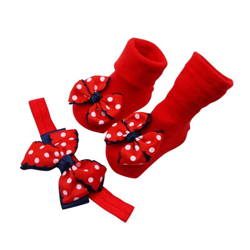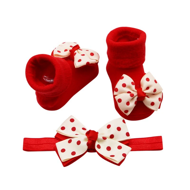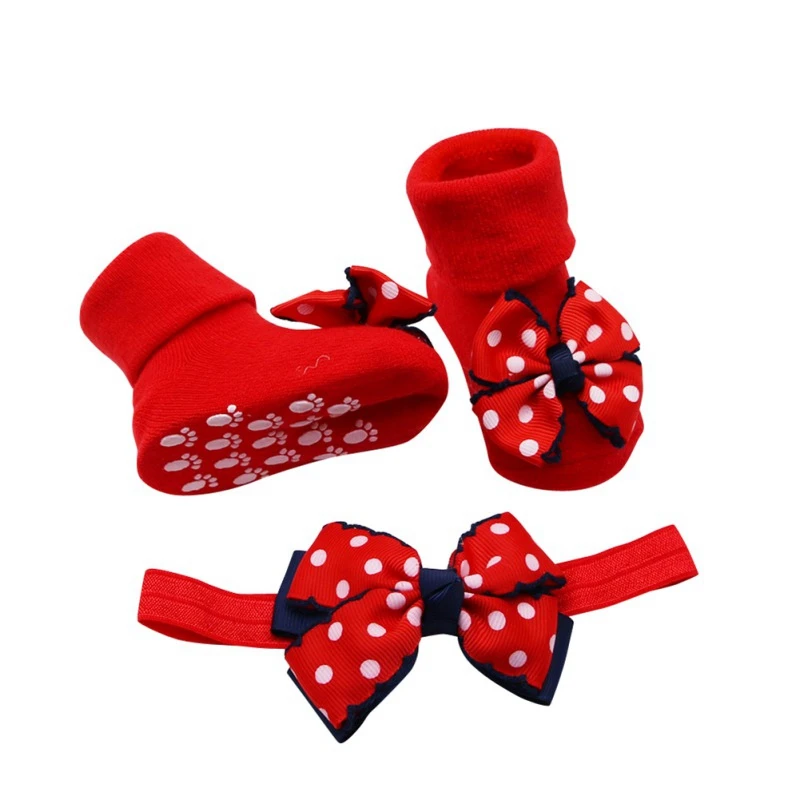 Двухслойные красные хлопковые носки в горошек с бантом для малышей Нескользящие Детские носки + лента для волос