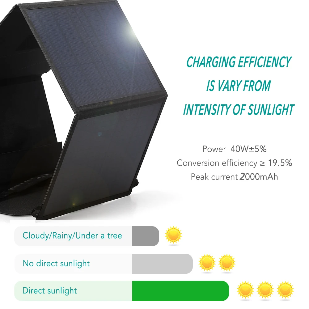 Быстрая зарядка: 40 Вт солнечная панель с более чем 19.5% эффективностью преобразования и выходным пиковым током 2000 мАч.