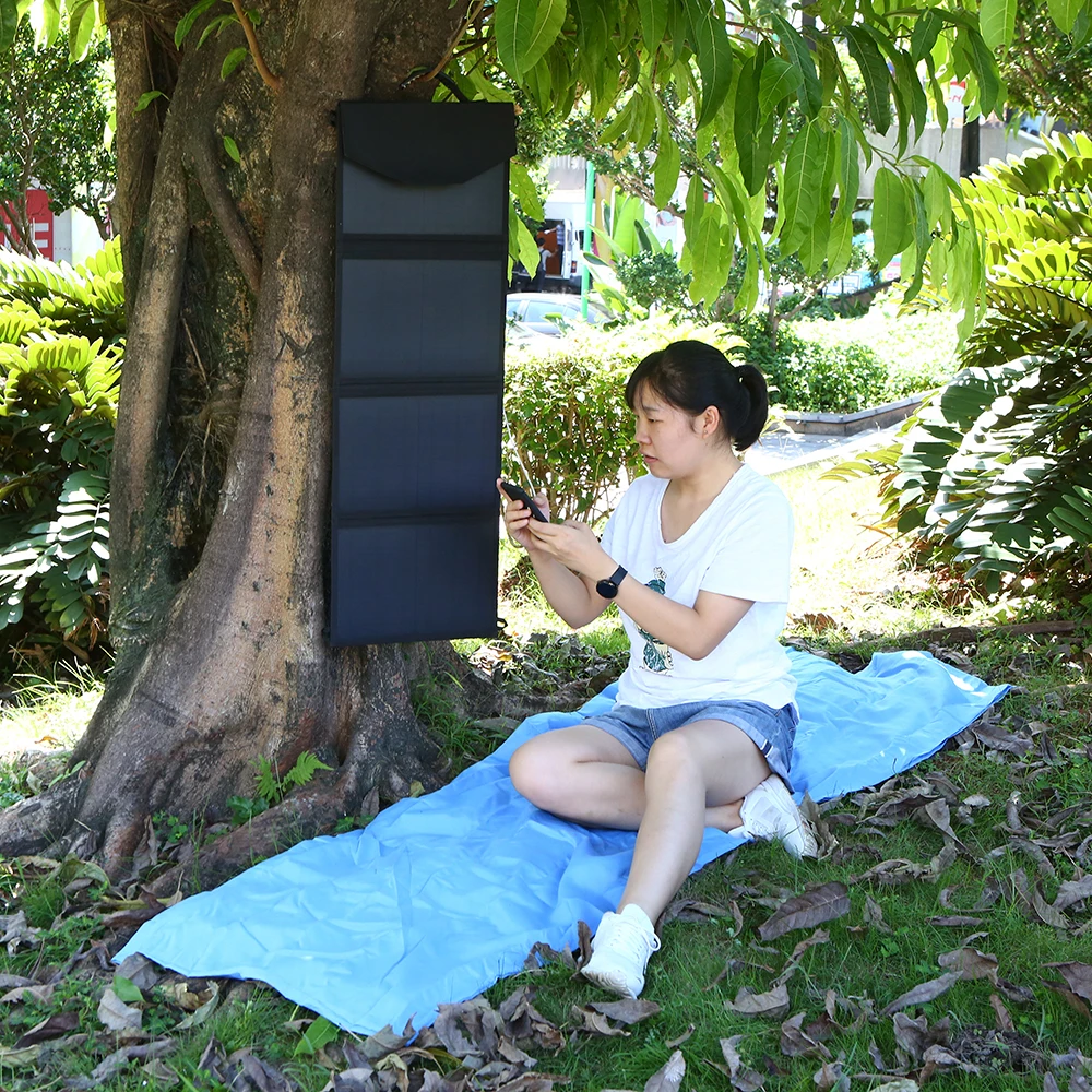 Просто Повесьте его на дерево, и солнечная панель ПЭТ Эффективно преобразует солнечную энергию в электрическую, так чтоВы можете зарядить свой телефон, планшет и устройство с usb-портом (5 В) или портом постоянного тока во время отдыха после уставшего кемпинга, альпинизма и пеших прогулок, очень Экологично и удобно.
