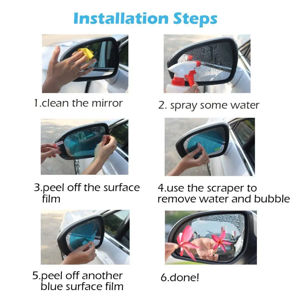 Шаги по установке: после очистки зеркала заднего вида, Оторвите пленку № 1, вставьте ее в окна, снимите пузырьки с помощью скребка, а затем оторвите пленку № 2.