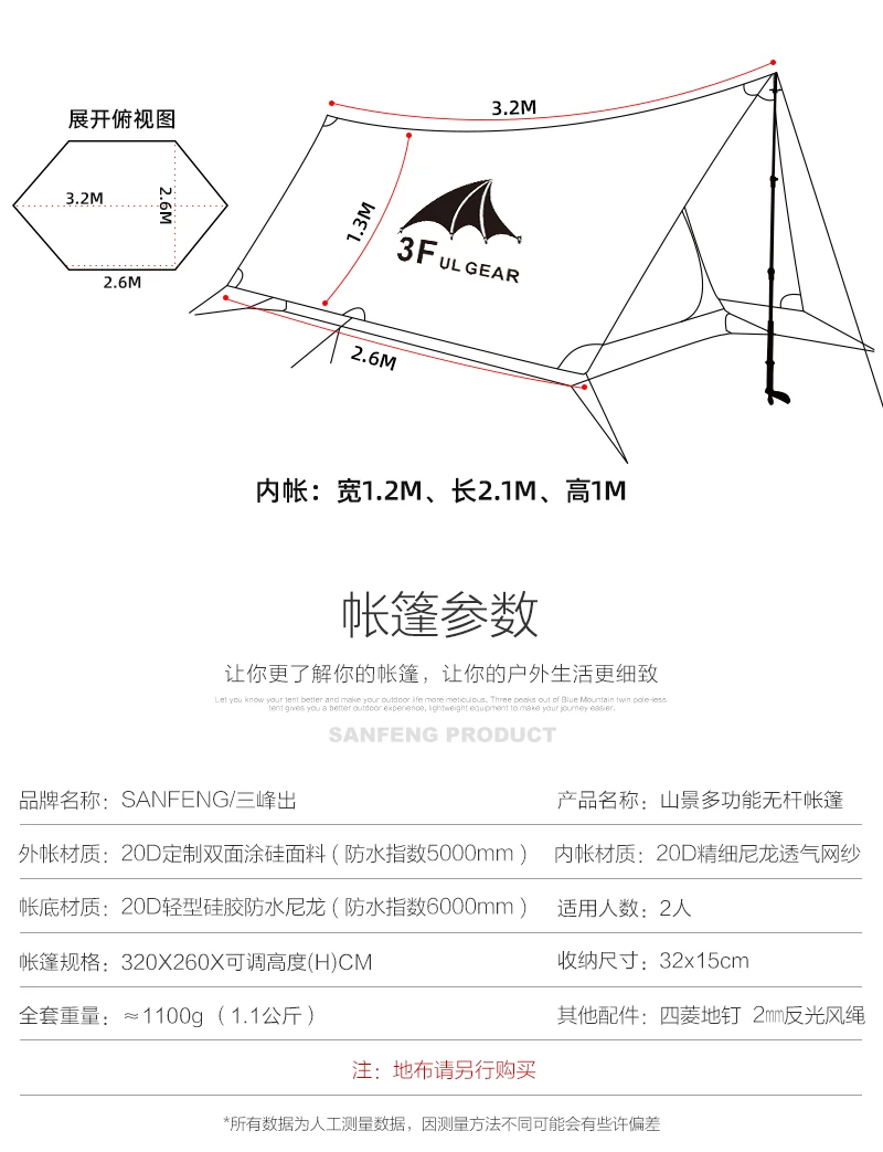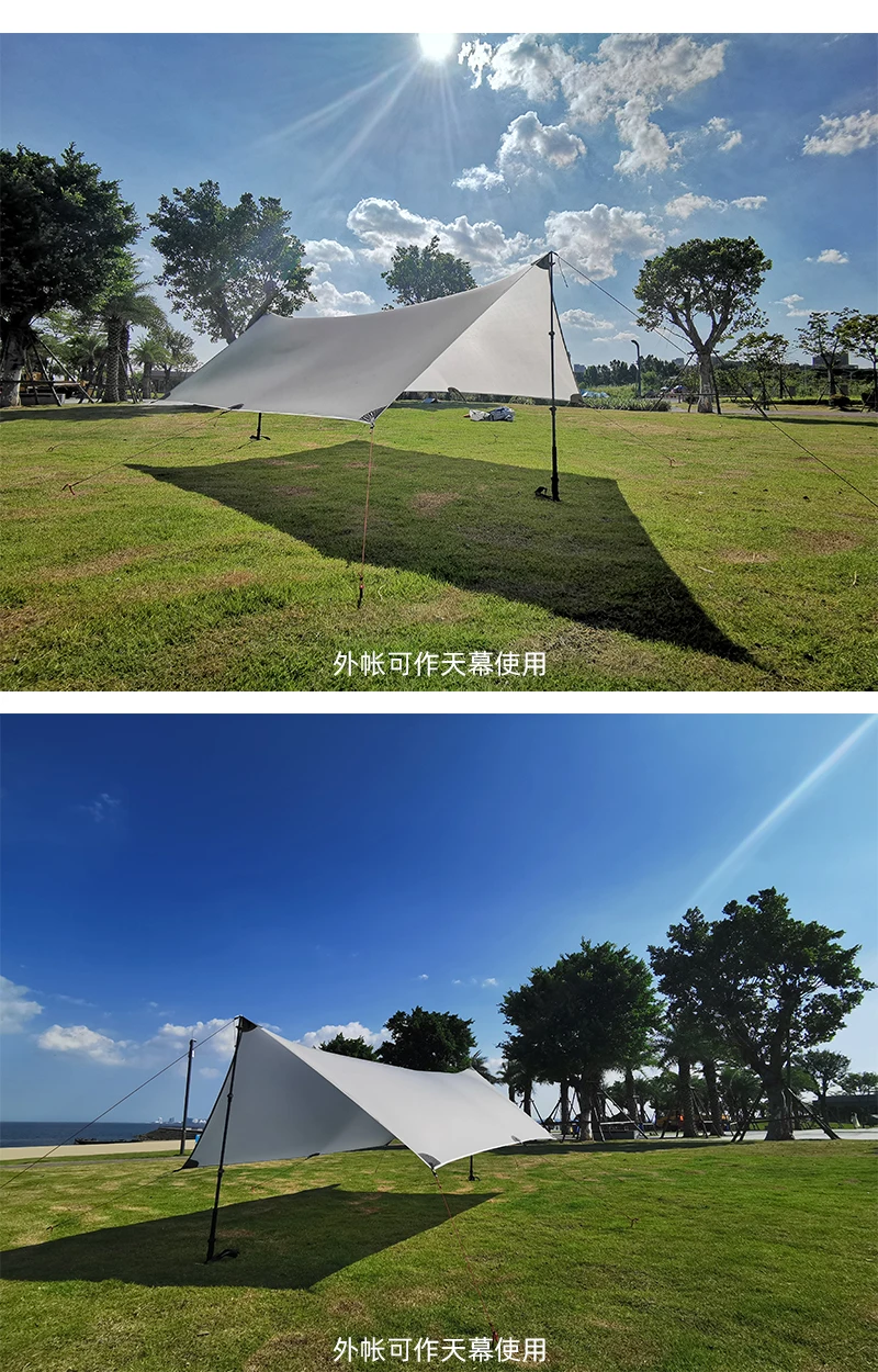 Упаковочный лист: 1 тента 1 внутренняя палатка 8-ю 1 колышки сумка для переноски 8 веревки 1 палатка сумка для переноски 2 ремонтные колодки Размер Flysheet: 320x260x260 см, регулируемая высота Размер внутренней палатки: 210x120x100 см, высота 100 мм Вес: около 1100 г Ткань Flysheet: 20D Подгонянный нейлон двустороннее силиконовое покрытие анти-разрыв плед, 5000 мм Ткань внутренней палатки: нейлон Нижняя ткань: 20D клетчатая нейлоновая защита от разрывов, 6000 мм Полюсов: без палки Рекомендуется использовать ваши трости для ходьбы в качестве палаточных палок или купить палки Посылка Размер: 32x16x16 см Flysheet можно использовать отдельно в качестве брезента.
