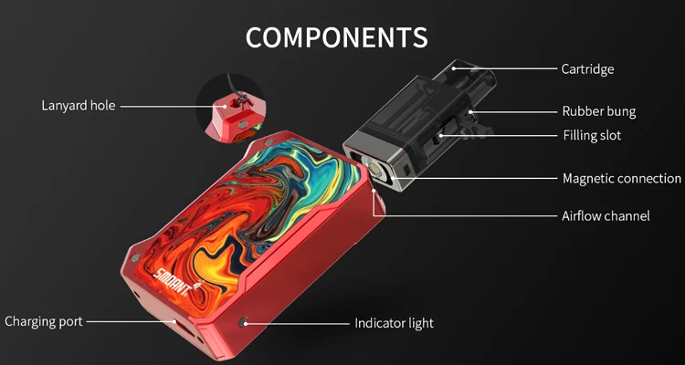 1. Поставляется с емкостью 2 мл e-juice 2. Питание от встроенного аккумулятора 750 мАч 3. Оснащен светодиодный ным индикатором уровня питания 4. Совместим с 2 типами катушек: сетчатая катушка 0,6 Ом и катушка Ni-80 1,2 Ом 5. Принять дизайн воздушного потока, чтобы избежать утечки и обеспечить чистый аромат 6. Работает на смарт-чипе Ant 7. Выберите шнурок для повседневной переноски 8. Используется технология проведения искусственной реанимации для красочного и долговечного потрясающего покрытия