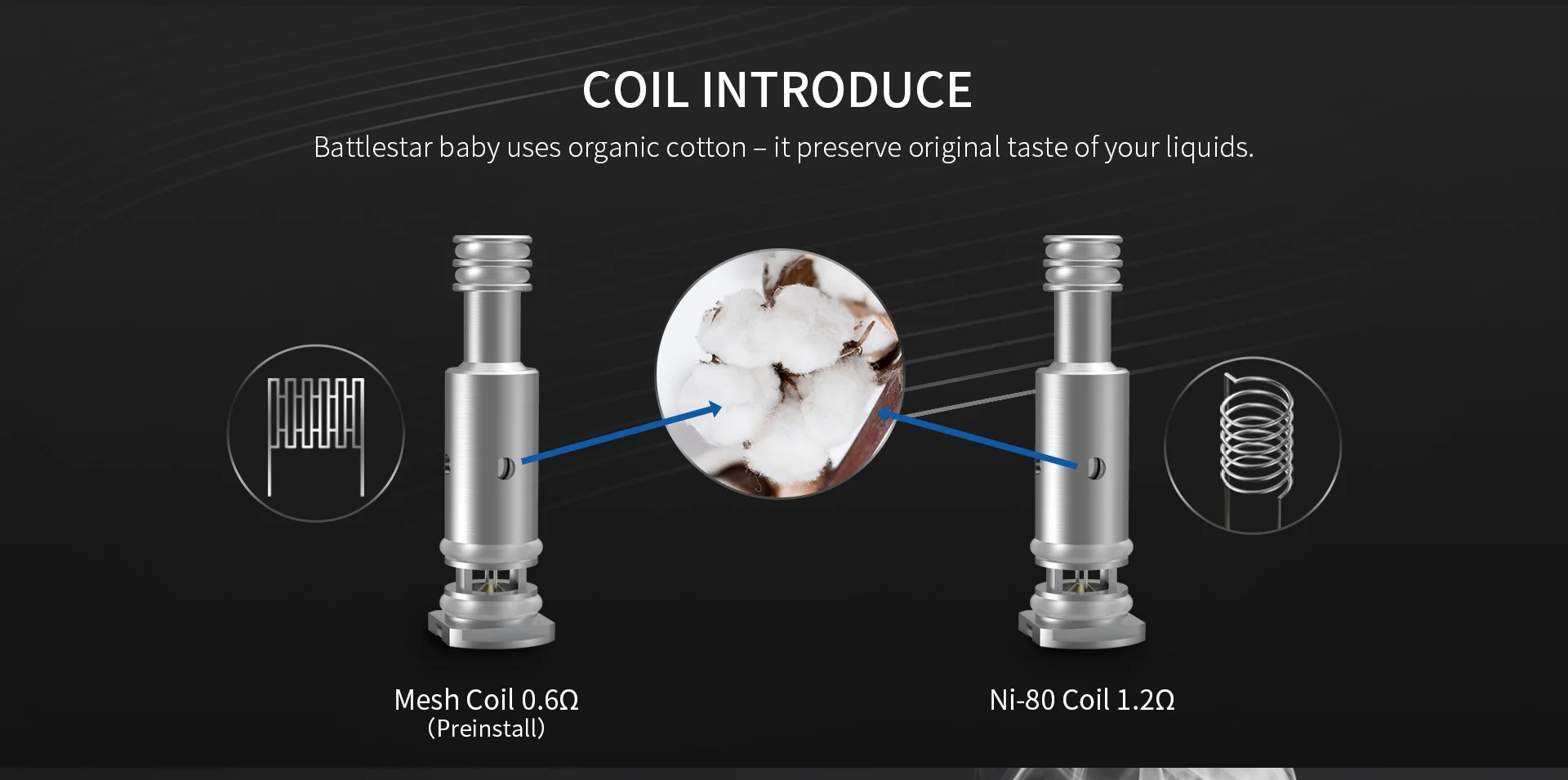 Battlestar Baby Pod-набор-это компактный и портативный комплект pod-системы. Поставляется с емкостью 2 мл e-juice и встроенным аккумулятором 750 мАч. Он также совместим с 2 типами катушек: сетчатая катушка 0,6 Ом и катушка Ni-80 1,2 Ом. Кроме того, используется независимая конструкция воздушного потока, чтобы избежать утечки и обеспечить чистый аромат. Кроме того, оснащен светодиодный ным индикатором и умным чипом ant, что дает вам Прекрасные впечатления от вейпинга. И он выбирает зарядный кабель для повседневной переноски. Последнее, но не менее важное, он использует технологию проведения искусственной реанимации для красочного и долговечного потрясающего покрытия. Сейчас он доступен в 6 цветах: черный, красный, нержавеющая сталь, оружейный металл, синий, зеленый.