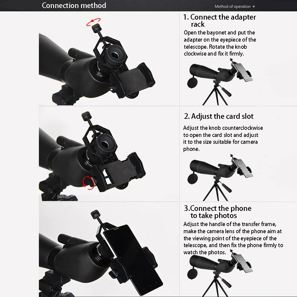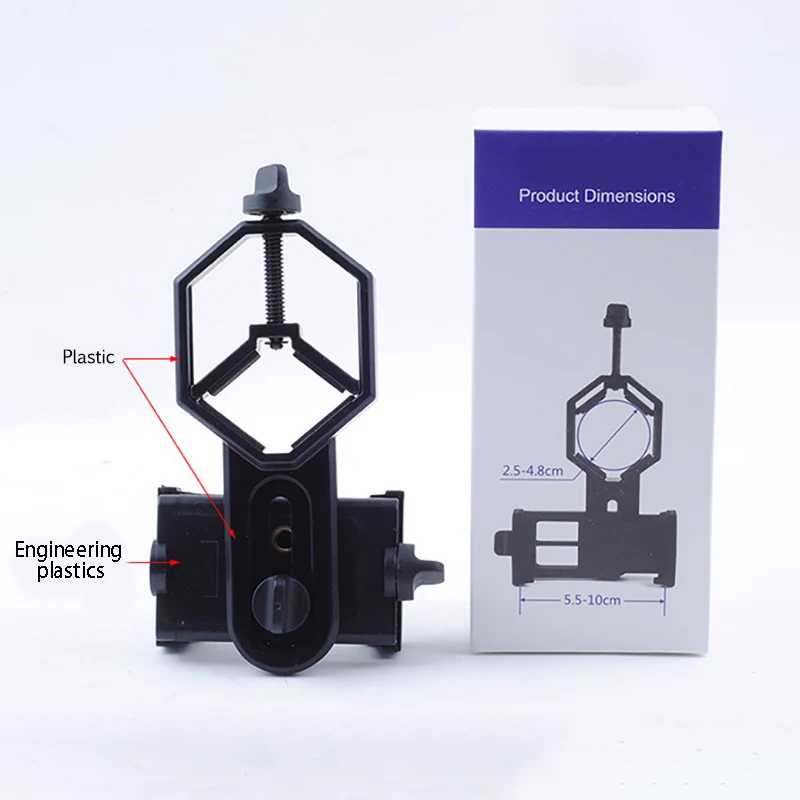 Зажим для телефона телескопа изготовлен из высококачественного алюминиевого сплава в качестве корпуса и АБС-пластика в качестве держателя телефона, который является легким и прочным. Он используется для длительного времени.