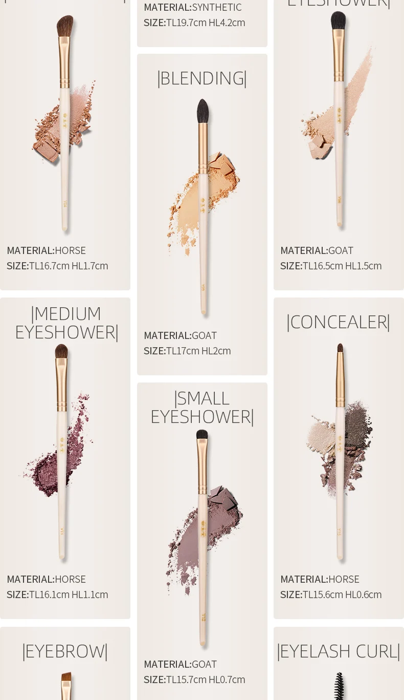 STQ15BYT & STQ15BYT KTBYTКисть для пудры Q01Длина кистей: 18,7 см длина волоса: 5,2 смТип волос: синтетический ворс Тип ручки: деревоНанесение: мастерски разметайте на румянах, пудре.Кисть для румян Q02Длина кистей: 17,5 см длина волоса: 4,0 смТип волос: синтетический ворс Тип ручки: деревоПрименение: идеально подходит для контура или щек.Кисть для контуринга Q03Длина кистей: 16,5 см длина волоса: 3,0 смТип волос: синтетический ворс Тип ручки: деревоПрименение: для лба и скул.Кисть для основания Q04Длина кистей: 16,0 см длина волоса: 2,5 смТип волос: синтетический ворс Тип ручки: деревоПрименение: для жидкой основы или другихQ05 хайлайтер кистьДлина кистей: 19,7 см длина волоса: 4,2 смТип волос: синтетический ворс Тип ручки: деревоПрименение: Для хайлайтераF02 щетка вентилятораДлина кистей: 17,0 см длина волоса: 3,0 смТип волос: козья шерсть Тип ручки: деревоПрименение: для подметания на хайлайтер и дополнительной пудры.Теневая щетка для носа Y04Длина кистей: 17,0 см длина волоса: 1,7 смТип волос: конский волос Тип ручки: деревоПрименение: Для носовой стороны.Y05 BlendingBrushДлина кистей: 17,0 см длина волоса: 2,0 смТип волос: козья шерсть Тип ручки: деревоПрименять: наносить тени оттенки.Кисть для теней Y06Длина кистей: 16,5 см длина волоса: 1,5 смТип волос: козья шерсть Тип ручки: деревоПрименение: для теней и оттенков и всей области глаза.Маленькая кисть для теней Y11Длина кистей: 15,7 см длина волоса: 0,7 смТип волос: конский волос Тип ручки: деревоПрименение: для более темных оттенков на веко.Кисть для теней Y12 detailДлина кистей: 15,6 см длина волоса: 0,7 смТип волос: козья шерсть Тип ручки: деревоПрименение: растушуйте более темные оттенки Смоки взгляда глаз.Щетка Y15 Precision BlendingBrushДлина кистей: 15,6 см длина волоса: 0,6 смТип волос: конский волос Тип ручки: деревоНанесите: теневая тонировка, сделайте тени для век более естественными.Кисть для глаз Z03Длина кистей: 15,6 см длина волоса: 0,6 смТип волос: синтетический ворс Тип ручки: деревоПрименение: кисть для бровей для пудры и кремовых средствГубка для губ Z02Длина кистей: 17,5 см длина волоса: 1,0 смТип волос: синтетический ворс Тип ручки: деревоНанесите: для губ форму, смягчите линии карандаша и нанесите цвет.Z05 щеточка для завивки ресницДлина кистей: 17,8 см длина волоса: 2,3 смТип волос: синтетический ворс Тип ручки: деревоПрименение: для ресниц и бровейST15BYT и ST15BYT KTBYTПорошковая щетка L01Длина кистей: 18,5 см длина волоса: 5,0 смТип волос: козья шерсть Тип ручки: деревоНанесение: мастерски разметайте на румянах, пудре.Кисть для контуринга L04Длина кистей: 16,9 см длина волоса: 3,4 смТип волос: козья шерсть Тип ручки: деревоПрименение: для лба и скулКисть для румян L05Длина кистей: 17,0 см длина волоса: 3,5 смТип волос: козья шерсть Тип ручки: деревоПрименение: идеально подходит для контура или щек.Хайлайтер H01Длина кистей: 20,0 см длина волоса: 4,5 смТип волос: козья шерсть Тип ручки: деревоПрименение: Для хайлайтераПлоская кисть для контуринга HS01Длина кистей: 17,8 см длина волоса: 2,3 смТип волос: козья шерсть Тип ручки: деревоПрименение: для лба и скулF02 щетка вентилятораДлина кистей: 17,0 см длина волоса: 3,0 смТип волос: козья шерсть Тип ручки: деревоПрименение: для подметания на хайлайтер и дополнительной пудры.Теневая щетка для носа Y04Длина кистей: 17,0 см длина волоса: 1,7 смТип волос: конский волос Тип ручки: деревоПрименение: Для носовой стороны.Y05 BlendingBrushДлина кистей: 17,0 см длина волоса: 2,0 смТип во