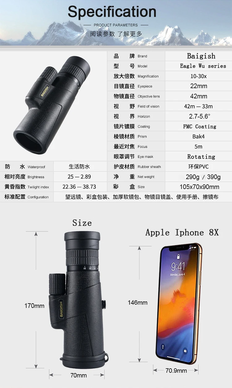 Военный монокулярный телескоп Baigish Zoom 10-30X42, HD BAK4 Prism, мощные снайперские шпионские бинокли для охотничьего лагеря
