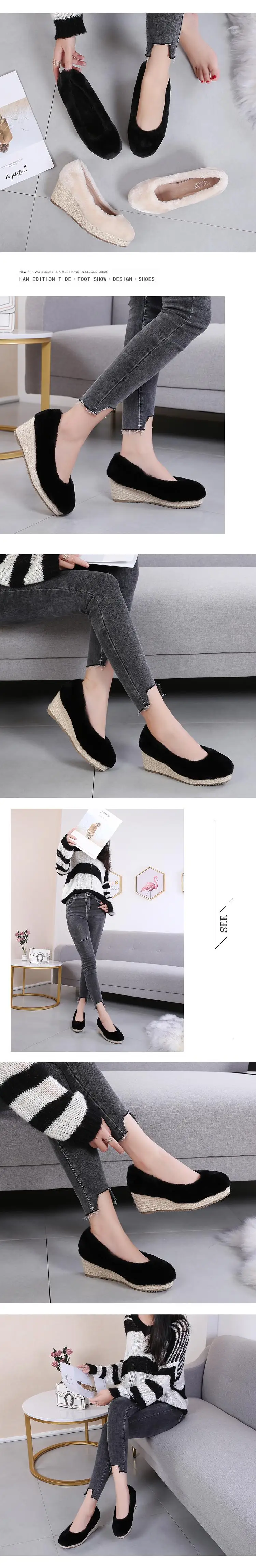 Женские туфли-лодочки на меху мех ягненка, теплые меховые сапоги на танкетке 2019 г. Зимняя женская Милая повседневная обувь плюшевая внутренняя бежевая, черная, размер 34-41