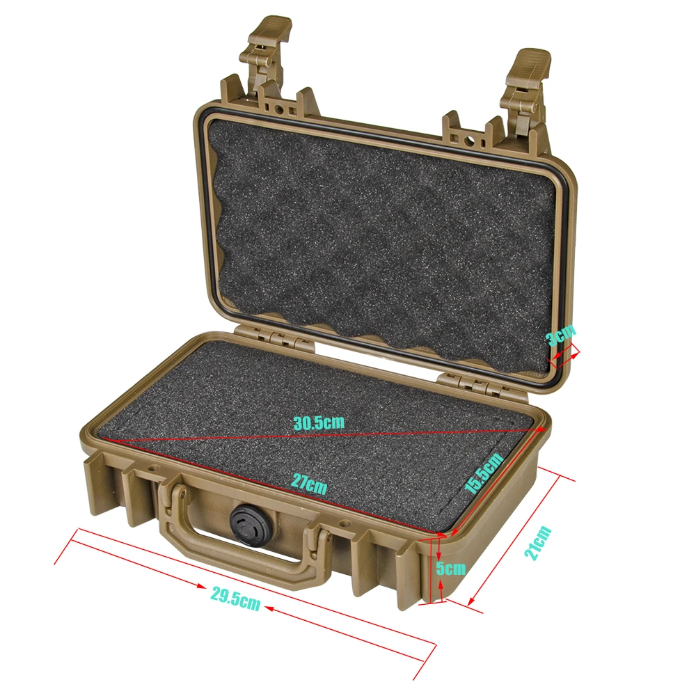 Материал: АБС-пластик Цвет: BK,FDE Уровень защиты: P68 Нормальный диапазон рабочих температур: от-40 до + 90 градусов, Водонепроницаемость, защита от столкновений, защита от пыли; Двойной открытый замок; Автоматический клапан баланса давления; Удобные Литые ручки; Поролоновый губчатый коврик, который был разрезан на маленькие колонны