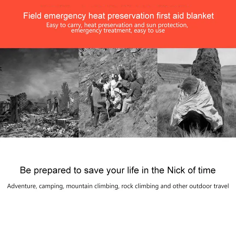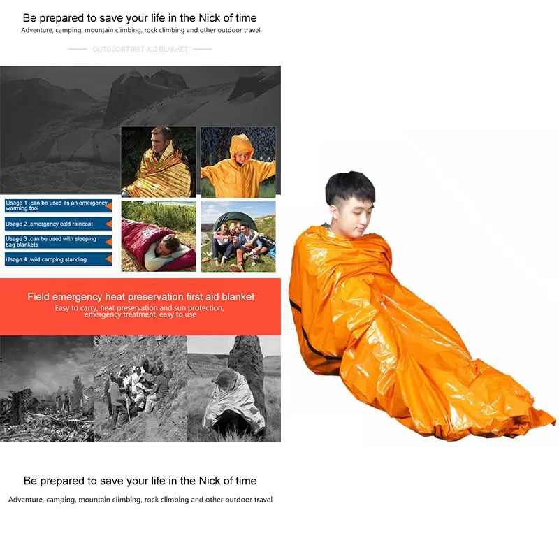 Спальный мешок изготовлен из долговременный светоотражающий полиэфирной пленки, которая может увеличить температуру вашего тела до 20 градусов В холодную и суровую погоду. Это обязательное снаряжение для выживания Для плохой погоды и уличных приключений, таких как ветер, сильный дождь и тяжелый снег.
