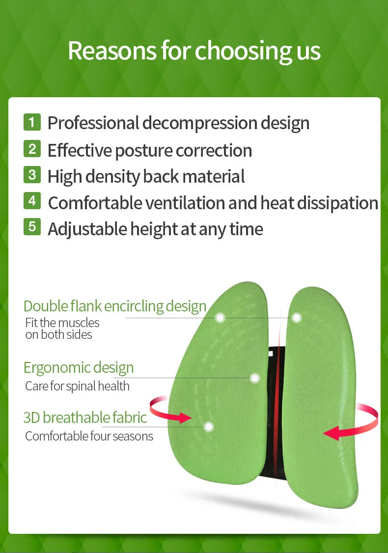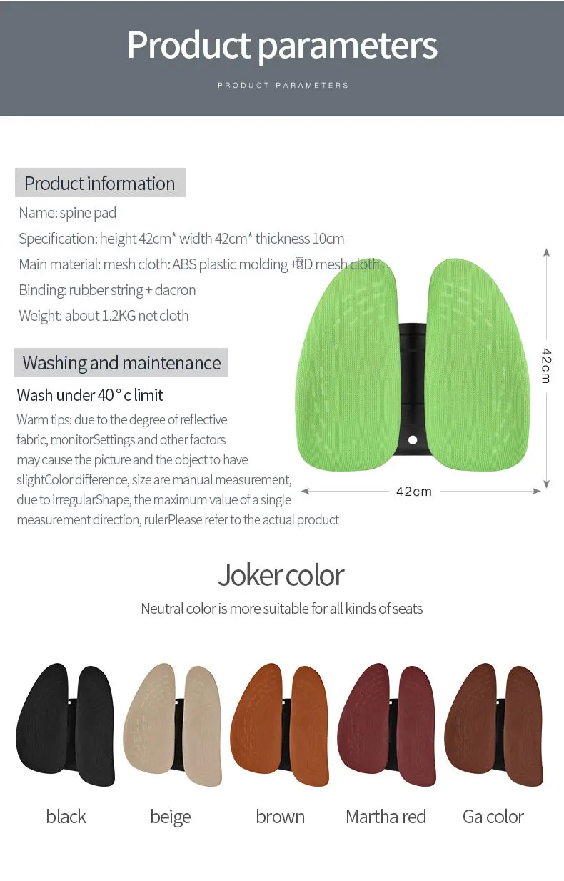 Технические характеристики: 1. Название продукта: Автомобильная поясничная подушка для позвоночника 2. Вес: около 1 кг 3. Цвет: черный, коричневый, зеленый, красный 4. Основной материал: сетчатая ткань + АБС-пластик 5. Размер: высота 42 см 'ширина 42 см' Толщина 10 см Особенности: 1. Он многофункциональный, может использовать авто, дома или в офисе. 2. Не только текстура, но и сделать ваш автомобиль более роскошным. 3. Талия не будет болеть, а бедра не затеют из-за малоподвижности. 4. Сетчатый и полый дизайн, вентиляция, охлаждение и non-toxic.Comfortable вентиляция и отведение тепла 5. Эргономичный дизайн, поясничная поддержка подгонка талии изгиба, облегчение усталости вождения, даже сидя слишком долго не заставит вас чувствовать себя некомфортно Посылка включен: 1X Автомобильная поясничная Поддержка