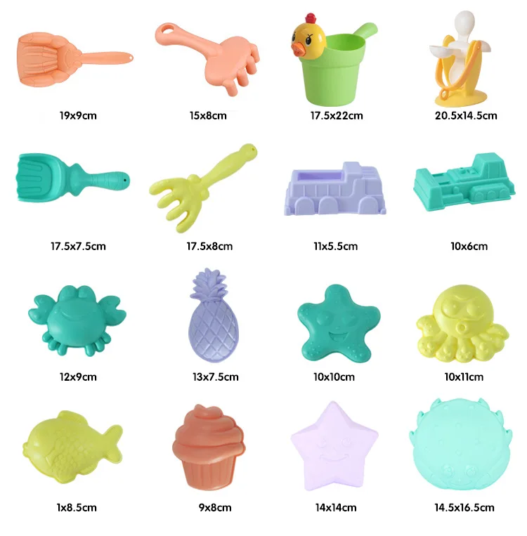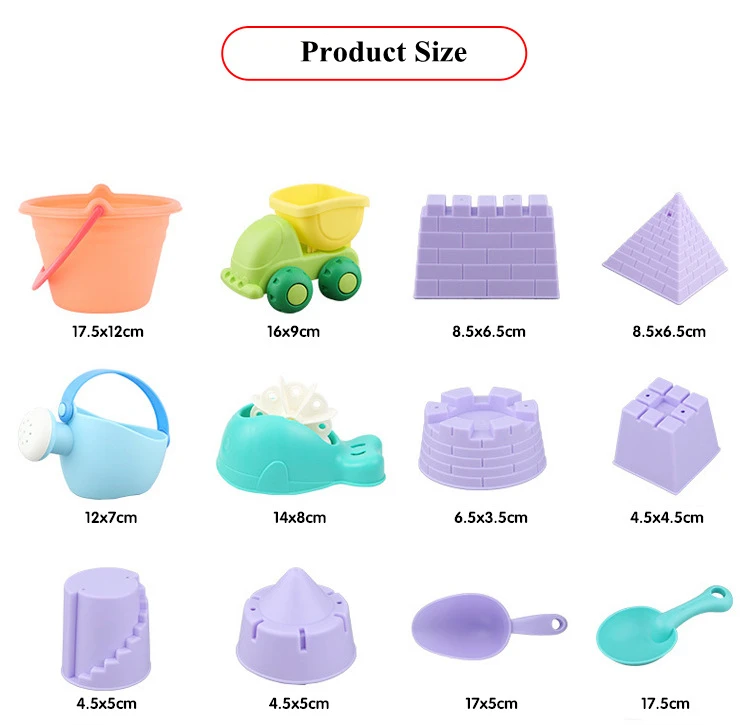 Посылка включает в себя ведро, песочные часы, моделирование животных, грузовик с песком, инструменты для копания.