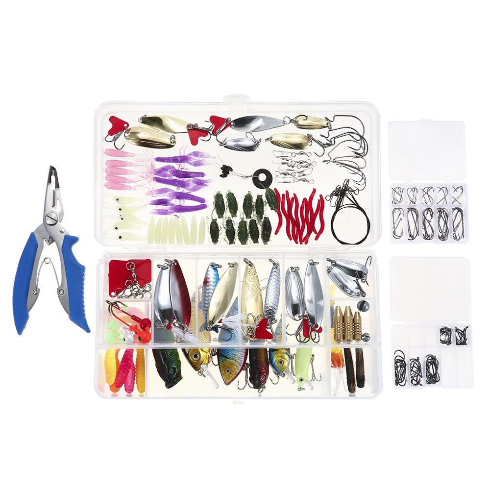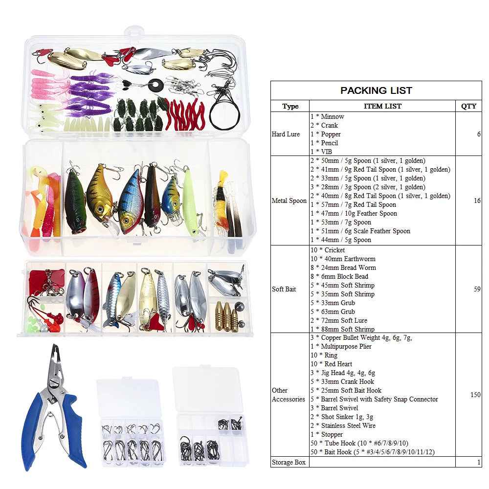 Включает приманки из твердого пластика, мягкие силиконовые приманки, блесны с блестками, рыболовные плоскогубцы, направляющие кольца, рыболовные крючки и другие аксессуары, всего 232 штук.
