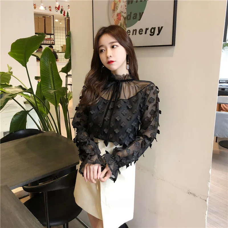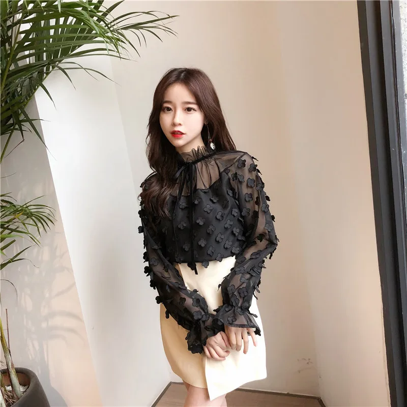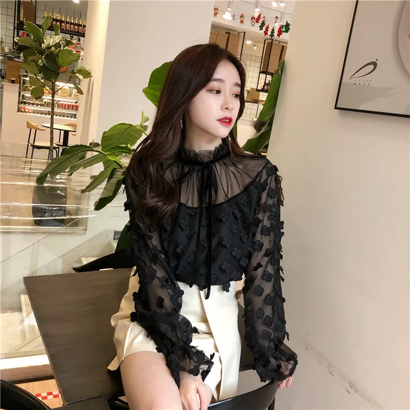 Сетчатый топ с бахромой, сексуальные Повязки Топы и блузки, черные с длинным рукавом и круглым вырезом, элегантные женские топы 2020, сорочка DF578 <