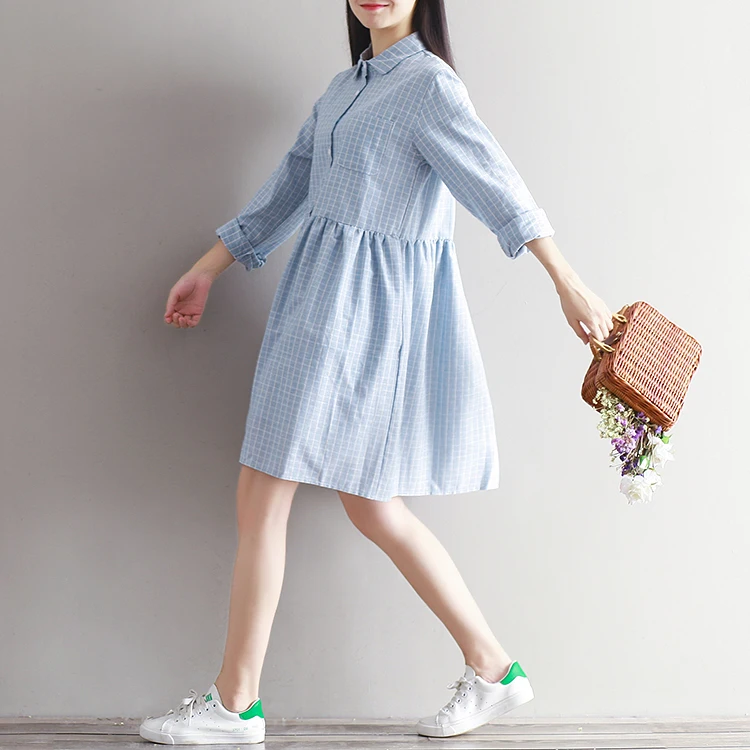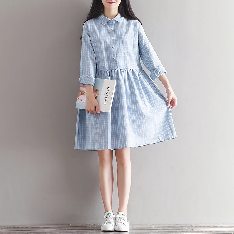 2020 Mori Girl весна осень Женское платье в клетку отложной воротник длинный рукав Vestidos Хлопок Лен ретро синее платье DC672 <