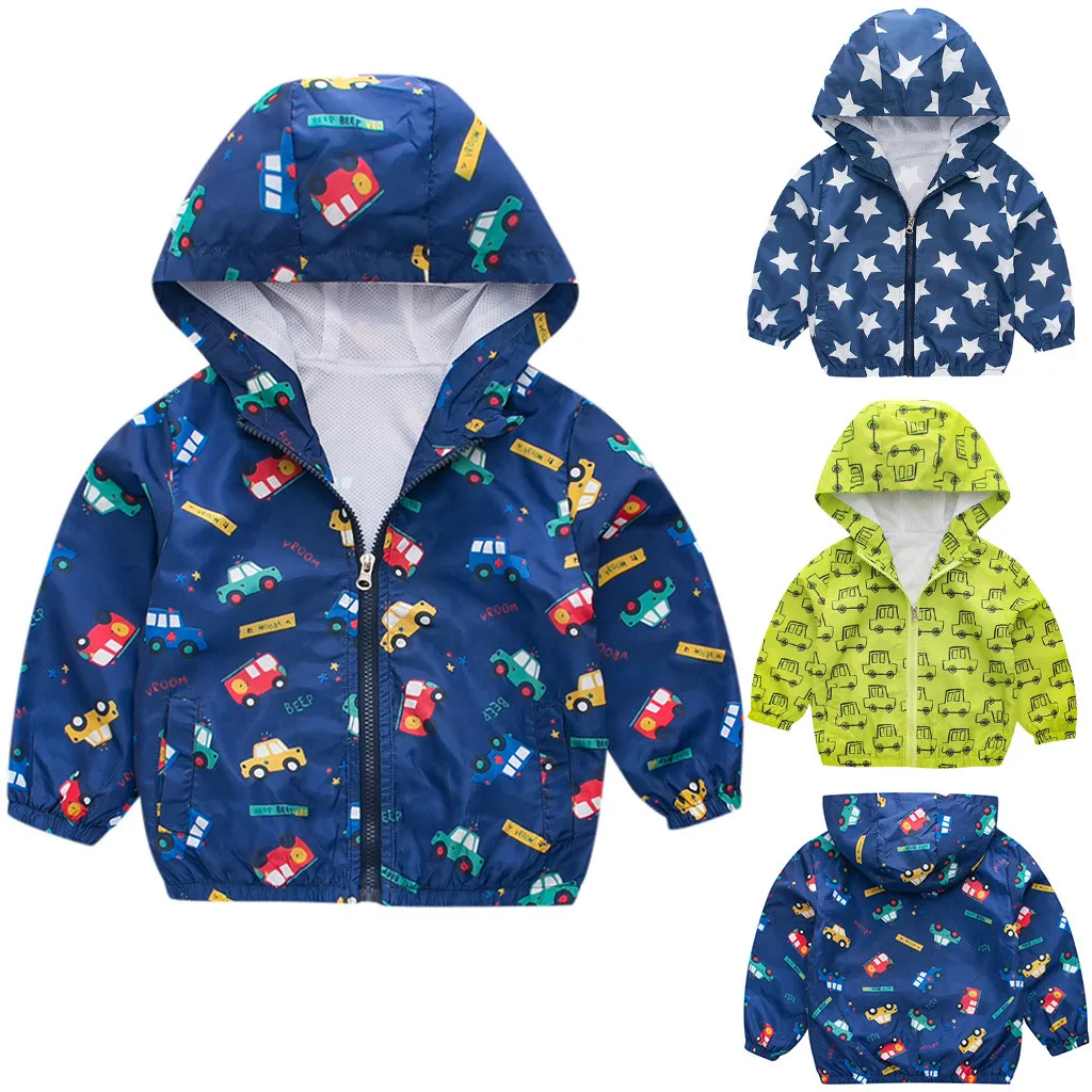 Ветрозащитное пальто с длинными рукавами и принтом в виде машины и звезды для маленьких мальчиков и девочек верхняя одежда с капюшоном