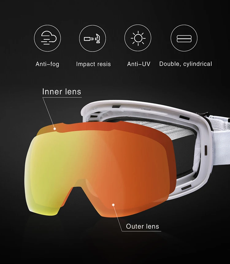 Внутренняя линза использует передовую супер-противотуманную технологию покрытия Отличная анти-Туманная производительность, избегая размытого зрения и делая катание на лыжах более безопасным.