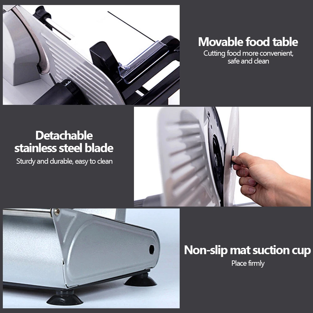 Регулируемая толщина: слайсер предлагает самый широкий регулируемый диапазон толщины (0,1 мм-15 мм) на рынке. Он отлично подходит для резки говядины, ветчины, бутербродов, досок для упаковки, холодных порезов, твердых сыров, фруктов, овощей и хлеба, нарезанных фруктов для обезвоживания, тарелок для вечеринок, закусок и многого другого.