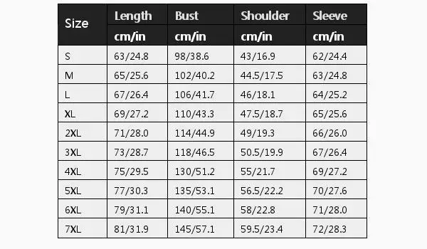 | Размеры::6XL | Длина (см/дюйм)::79/31.1 | Обхват груди (см/дюйм)::140/55.1 | Плечо (см/дюйм)::58/22.8 | Рукав (см/дюйм)::71/28 |