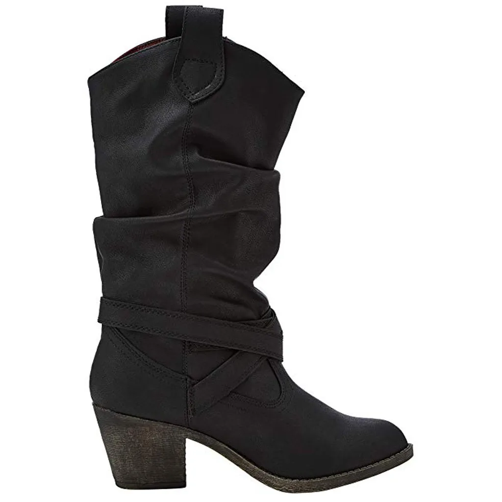 Женские кожаные сапоги до колена с перекрестными ремешками и пряжкой ковбойские сапоги на низком каблуке без застежки