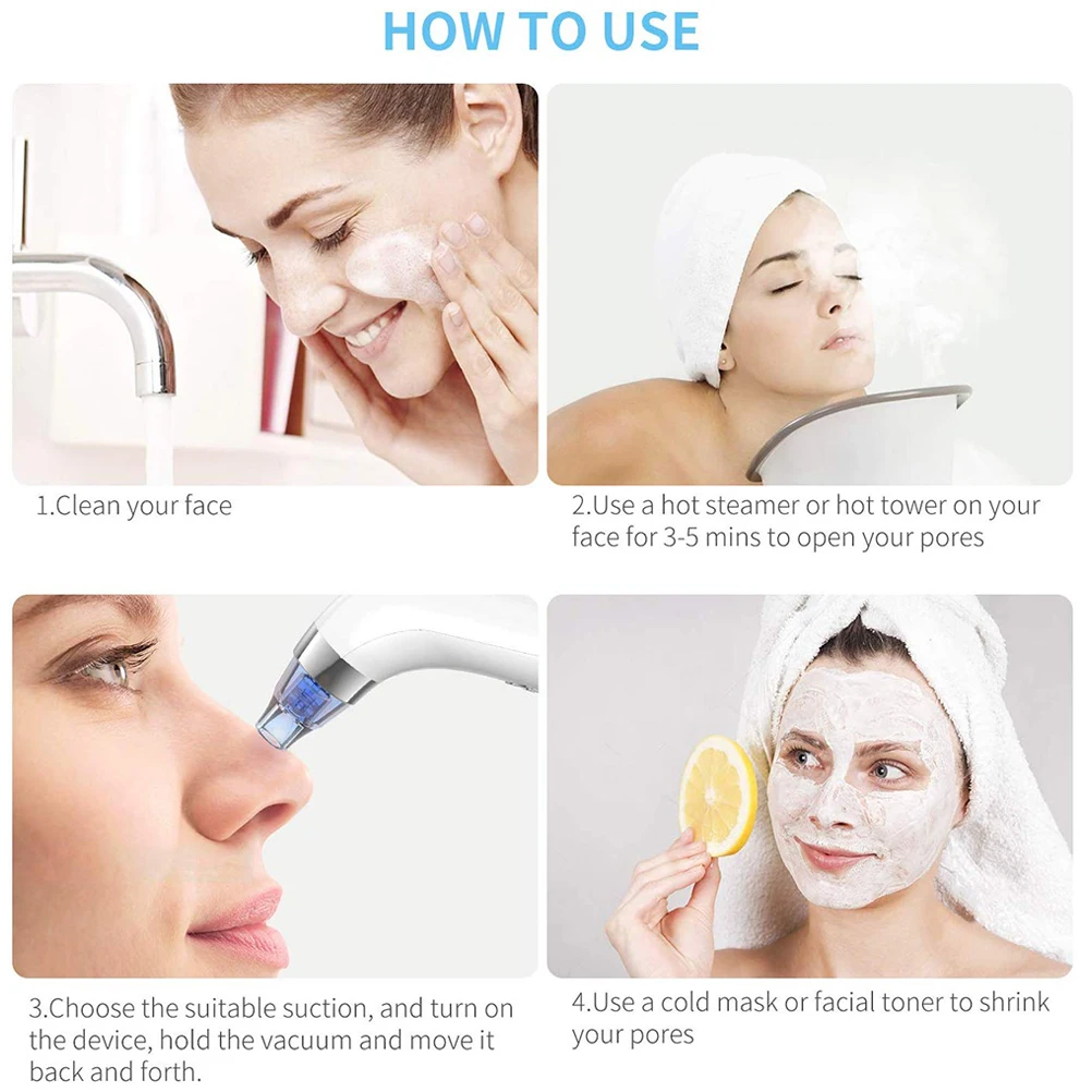 4 suction heads for professional treatment of different parts of your face, not only can remove blackheads, but also can tighten and tighten pores, clean, remove excess fat, remove excess skin fat, prevent acne.