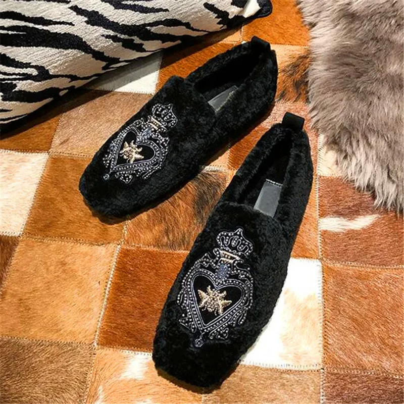 Меховые лоферы с квадратным носом без шнуровки; кожаная обувь на плоской подошве; модная повседневная обувь с вышитой медалью; зимняя женская обувь на плоской подошве для вождения
