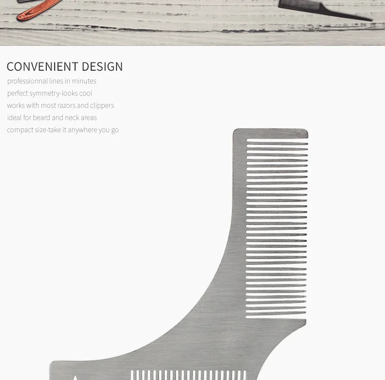 Особенности: 1. Изготовлен из нержавеющей стали, очень прочный. 2. Линейка бороды: очень удобна в использовании. 3. Усовершенствованная конструкция ручки: легко держать и использовать. Описание: Вы можете использовать его для формирования различных стилей бороды. Подходит для домашнего или профессионального использования.