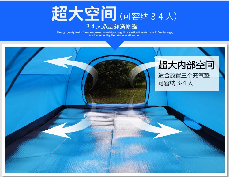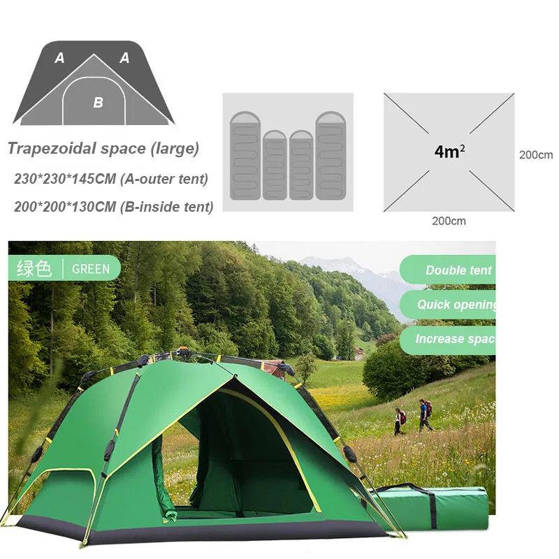 Есть 3 модели здесь. (1) размер на 1-2 человека: 210*140*110 см, подходит для 1-2 человек (2) размер на 3-4 человека: 210*200*135 см, подходит для 3-4 человек (3) размер двойного слоя: 240*210*135 см, это универсальная палатка