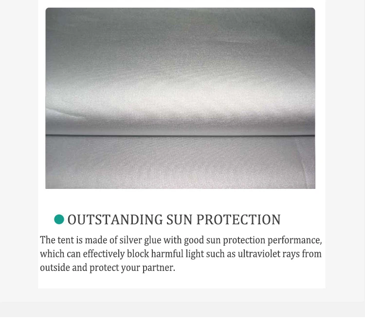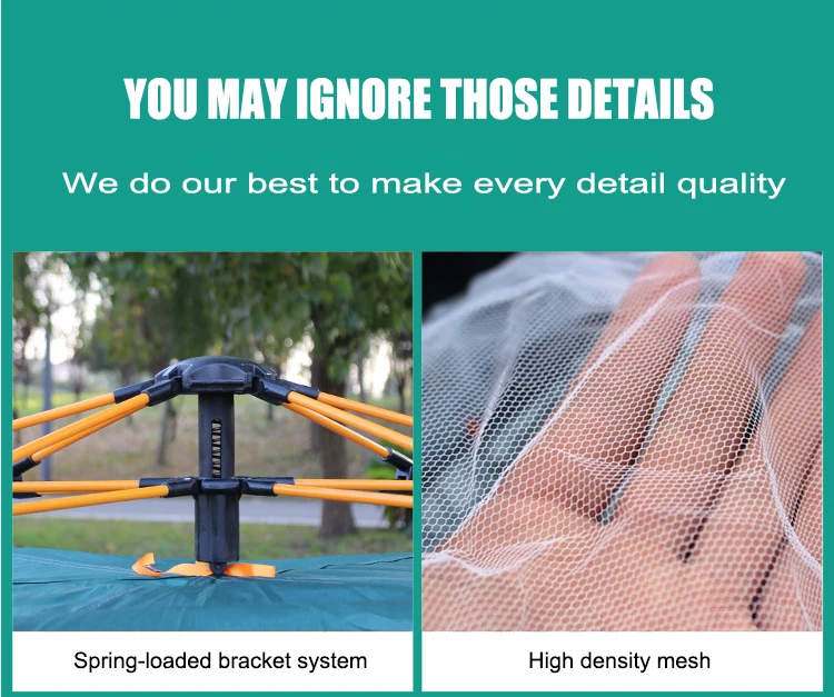 1.210D ткань Оксфорд, жесткий волоконный стержень для обеспечения высокого качества водонепроницаемый ветрозащитный тент 2. Новый дизайн, нет необходимости в громоздких шагах, легко открывать и закрывать 3. Полный набор аксессуаров: 8 гвоздей, 4 ветрозащитные веревки Есть 3 модели здесь. (1) размер на 1-2 человека: 210*140*110 см, подходит для 1-2 человек (2) размер на 3-4 человека: 210*200*135 см, подходит для 3-4 человек (3) размер двойного слоя: 240*210*135 см, это универсальная палатка 4. [сумка для хранения] Размер: 15*15*75 см (одно плечо или портативный) 5. Примечание: как правило, размеры, которые мы обозначили, измеряются вне палатки. Потому что палатка обладает определенной эластичностью. Значение будет иметь определенный диапазон колебаний. Пожалуйста, примите ошибки в пределах 5 см. Мы сделаем все возможное, чтобы обеспечить максимальный размер.